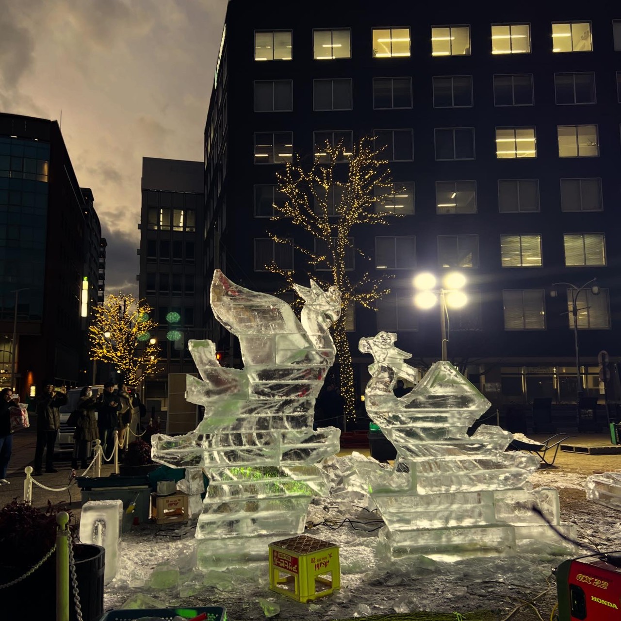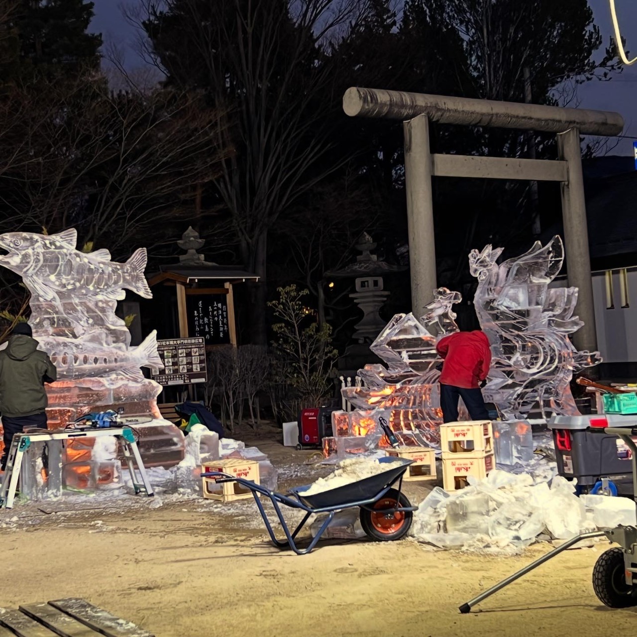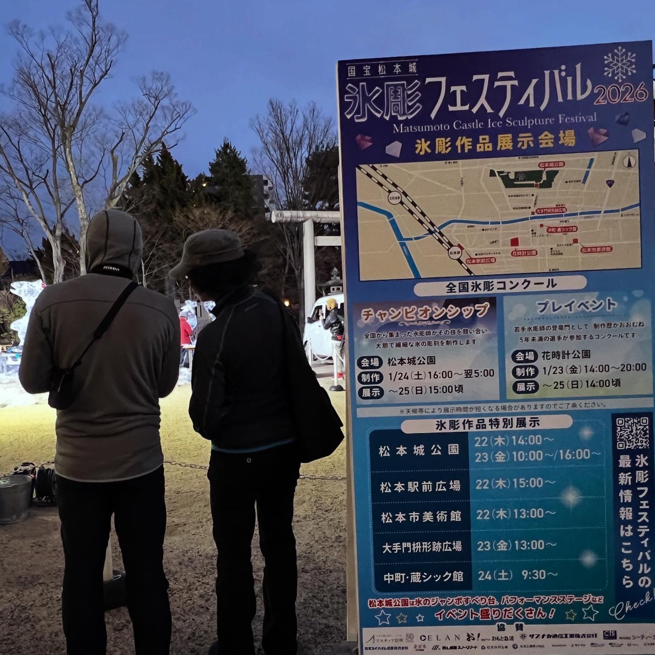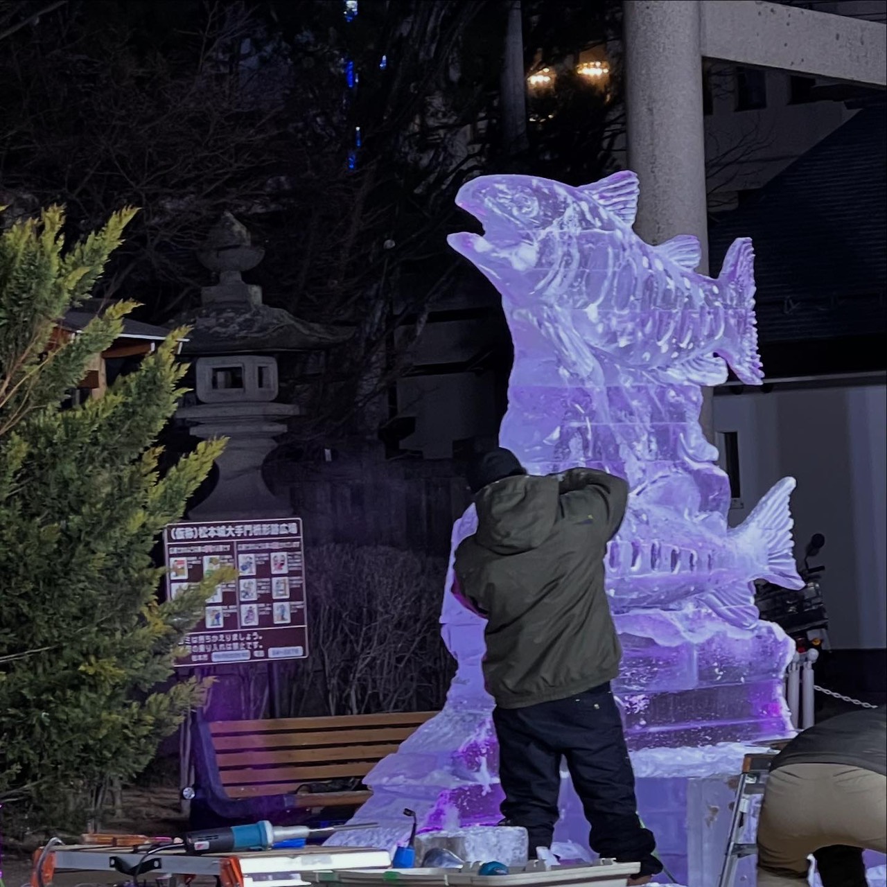 国宝松本城氷彫フェスティバル2026 枡形跡広場1月23日(金) イベントレポート 冬を楽しむ 市街地 松本さんぽ 氷彫 2026.1.23 ♥いいね 国宝松本城氷彫フェスティバル2026 1月22日(金) 街中展示 大手門枡形跡広場 枡形跡広場 夕方枡形跡広場に行くと氷彫はすでに進んでいました 氷彫制作中 氷彫制作中 今朝の最低気温は、氷点下8℃ほどの極寒 日中はお日様が出て体感温度は高めでしたが、夕方になり風が吹き始めるといっきに寒くなり この時点での気温は氷点下でしょうか。 あまりの寒さに見ているだけなのに、手袋の中の指がかじかんできました。 枡形跡広場 こんなにも寒い中 一晩中の氷彫制作 本当にご苦労様です。 明日の朝見に行きます 国宝松本城氷彫フェスティバル 松本城公園でも氷彫制作中です。 千歳橋のある風景 Tweet