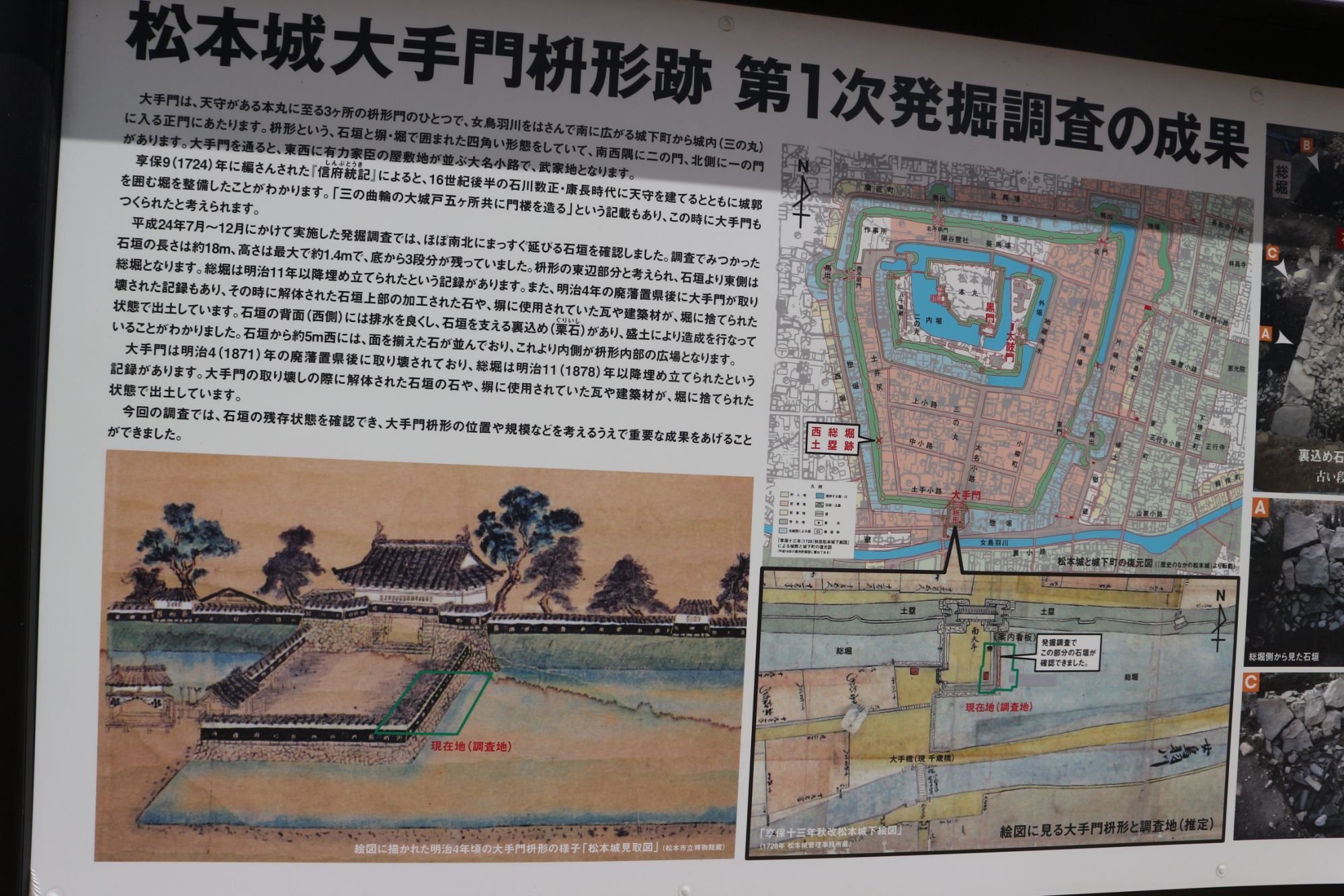 松本城大手門は、松本城三の丸の正面入り口として堅固な防御施設が築かれており、大手門めがけて南から攻め寄せた敵が女鳥羽川を渡っても、一旦直角に東に曲がらないと門の前面に到達できないようになっています。その直角に曲がったところに設けられているのが大手門枡形で、北側は大手門、西・東・南側の三方は総堀に囲まれており、さらに堀との境には塀が巡らしてありました。(松本市HPより)
