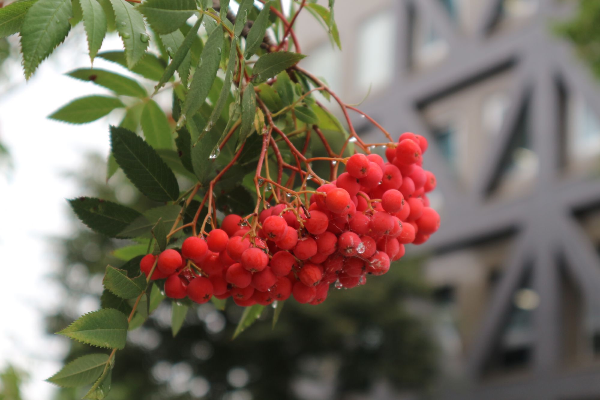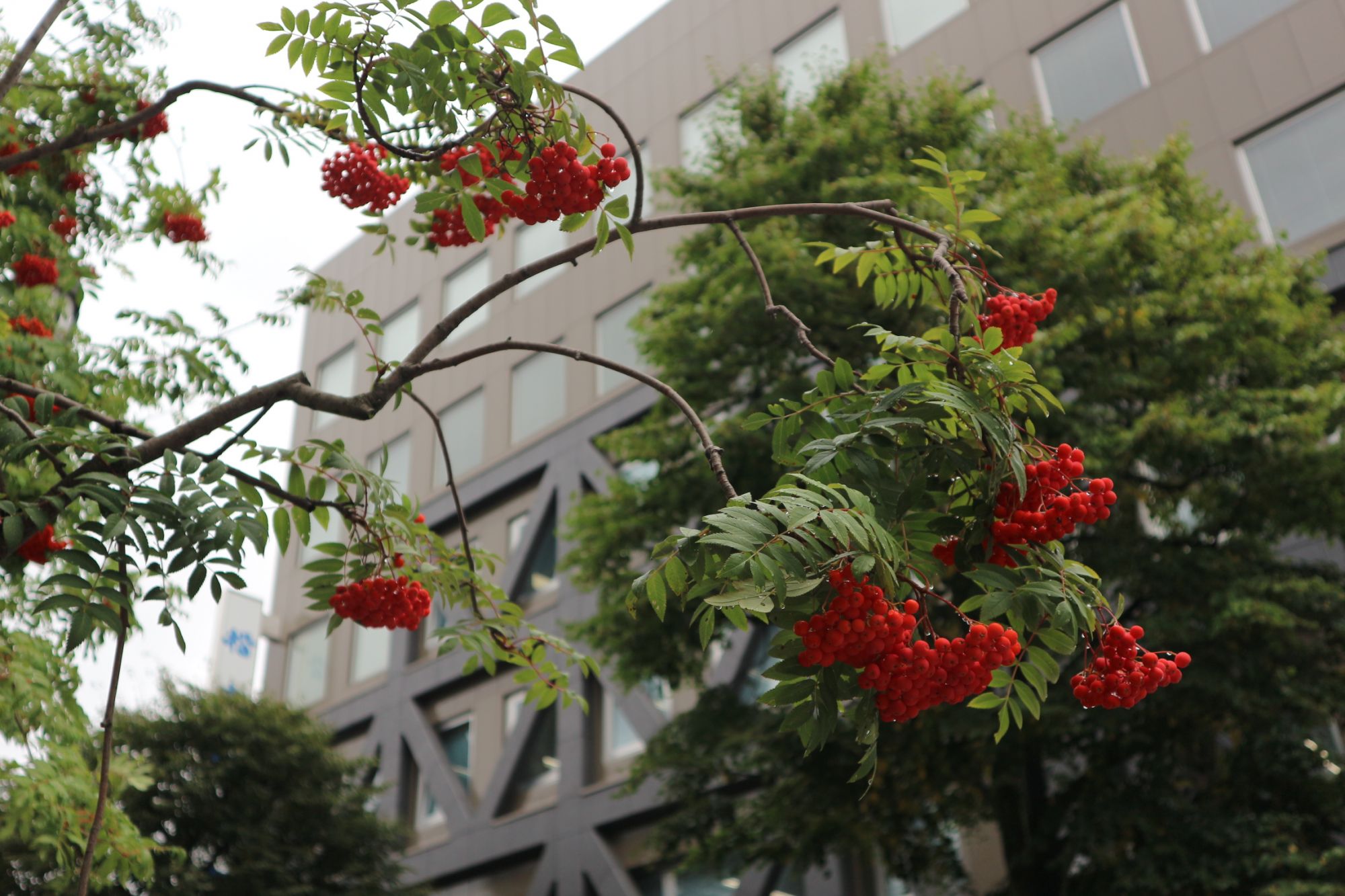 歩道から上を見上げると真っ赤なナナカマドの実