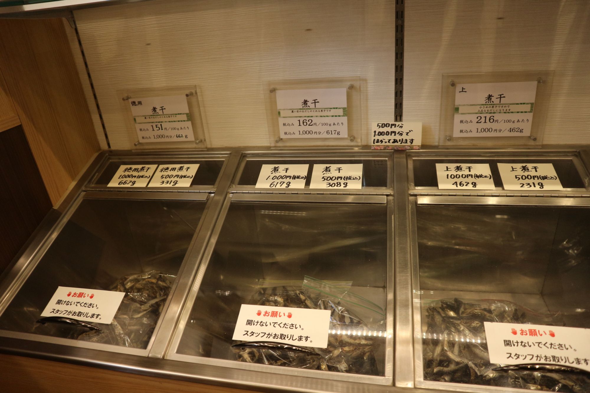 煮干しも同様に500円、1,000円と指定して購入します。
