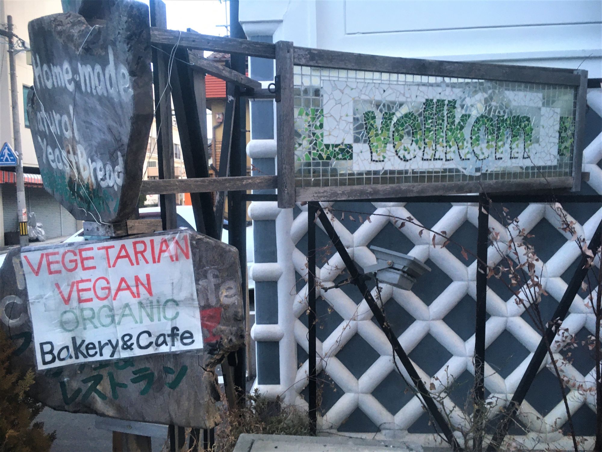 入口付近の看板には、「VEGETARIAN VEGAN ORGANIC Bakery&Cafe」と書かれています。
