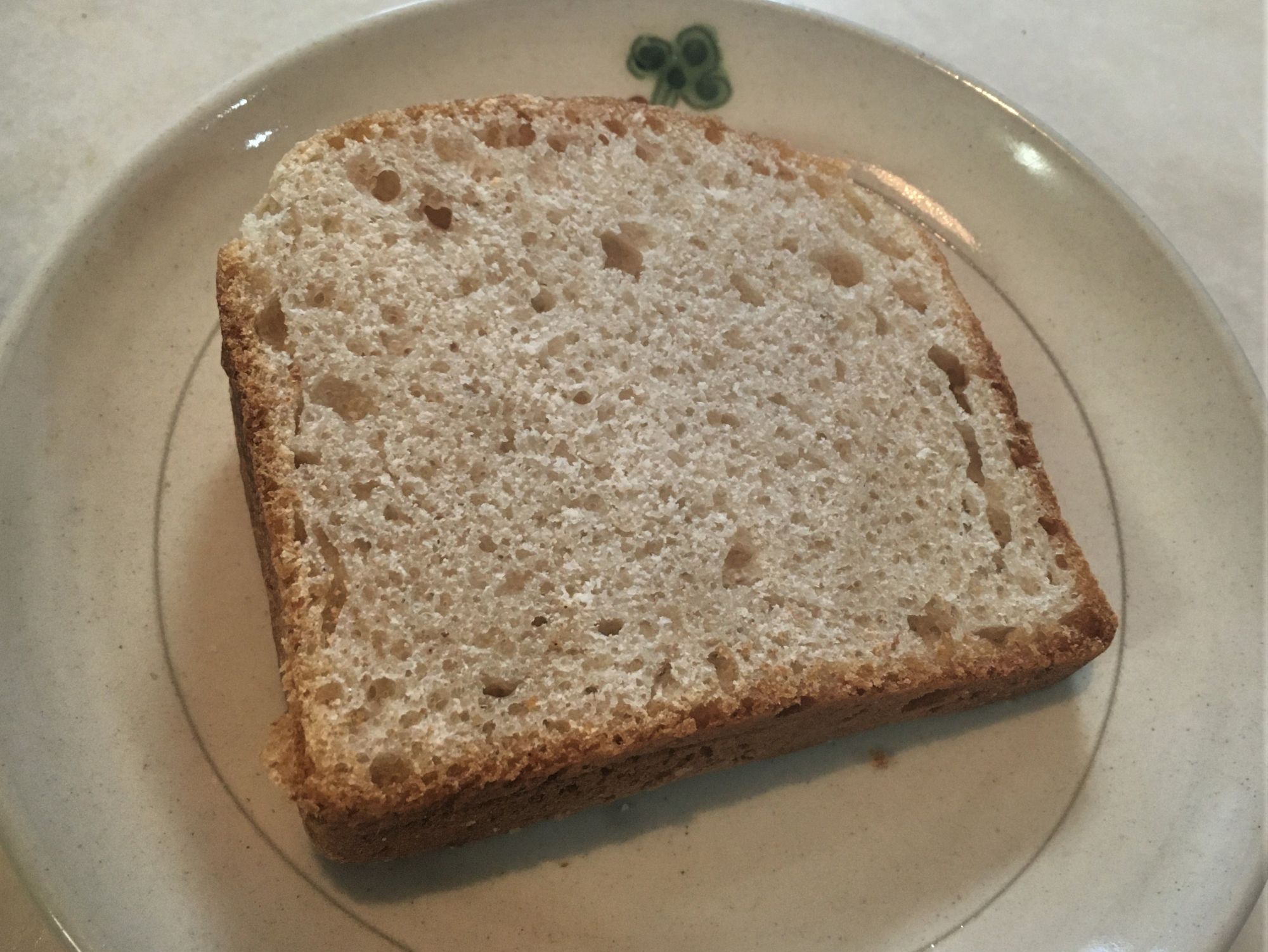 ミニサイズの食パンを購入しましたが、撮影し忘れ最後の一切れのみを撮影しました。天然酵母の酸味が美味しいしっかりした食パンです。美味しいです!