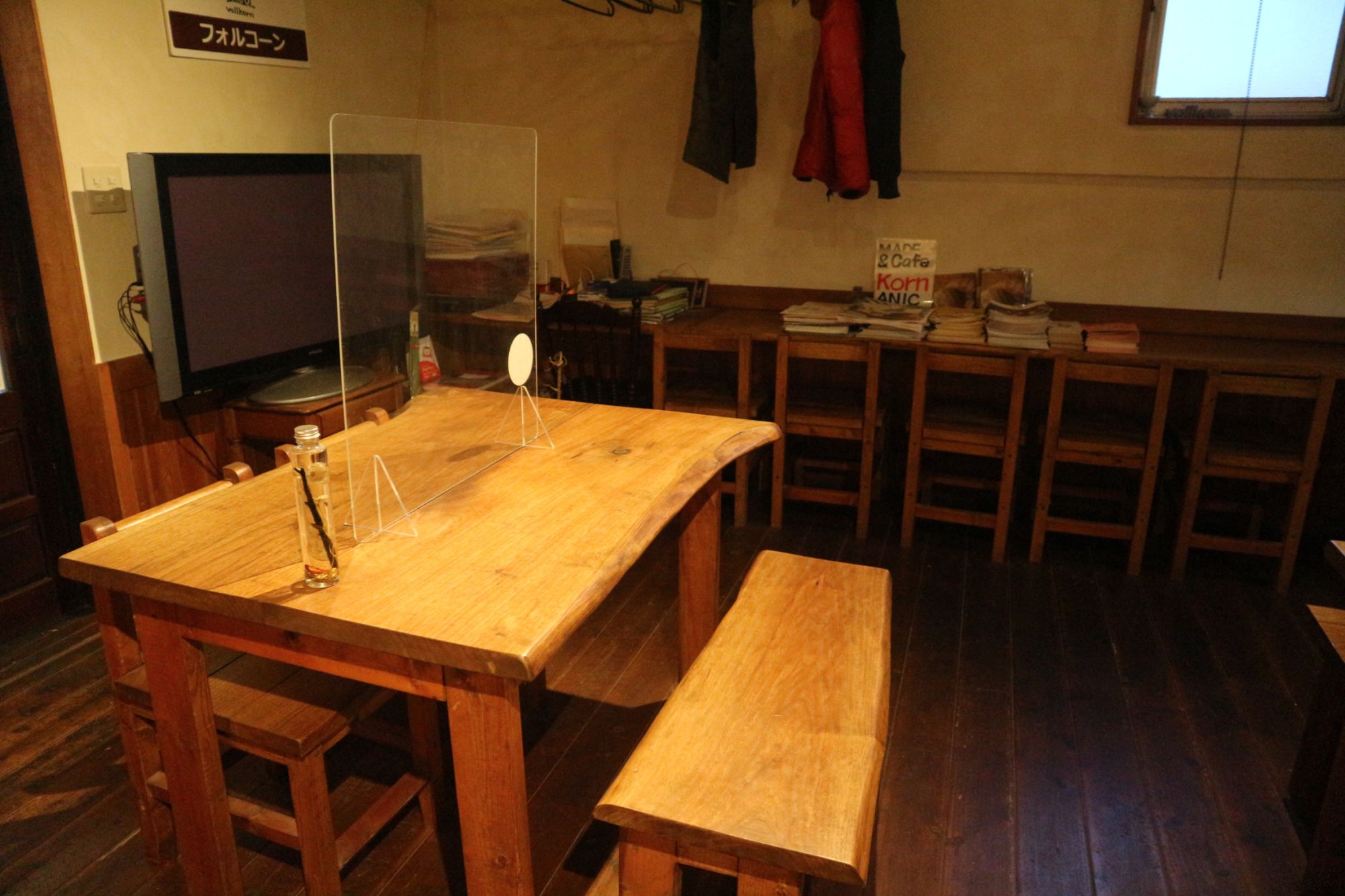 手作り家具のテーブル・椅子が置かれた落ち着いた雰囲気の店内