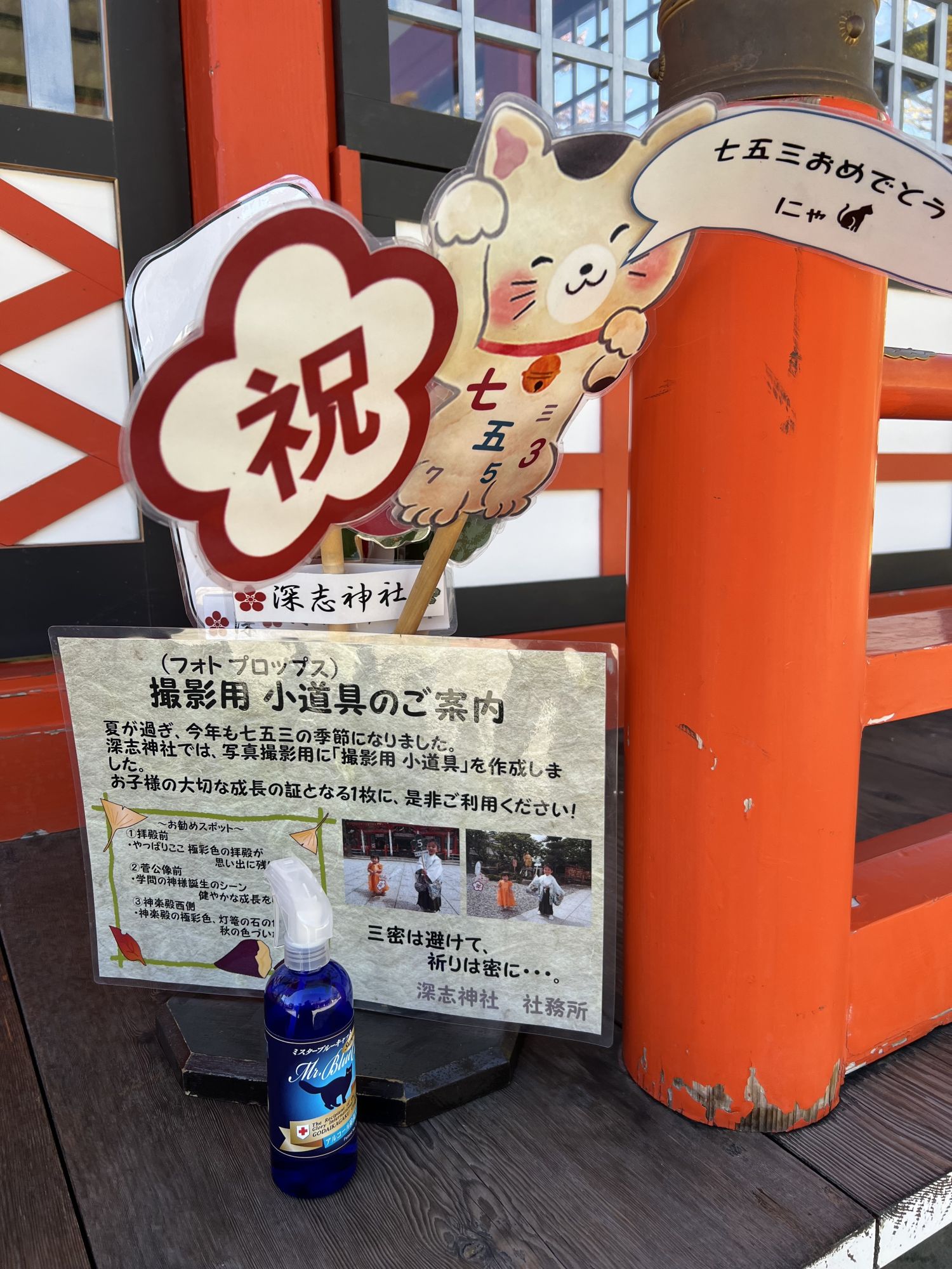 可愛らしい人形が置かれた台は、おみくじやお守りなどを撮影する台に使ってくださいと書かれています。