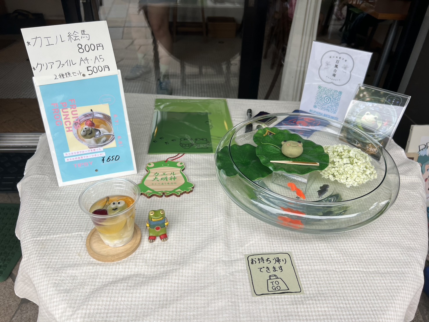 左側は、TIPSYさんのかえるまつりオリジナルメニュー かえるのフルーツポンチ 右側がかえるの練りきり