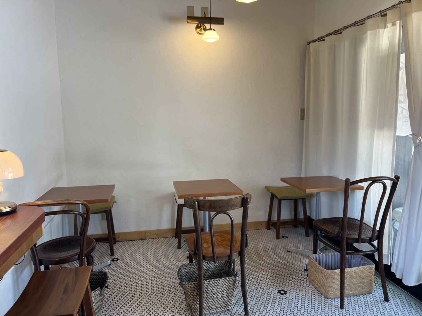 店内は白を基調とした配色に木や真鍮のランプシェード 落ち着いた雰囲気の中でも銘形さんのセンスが光るオシャレな空間です。