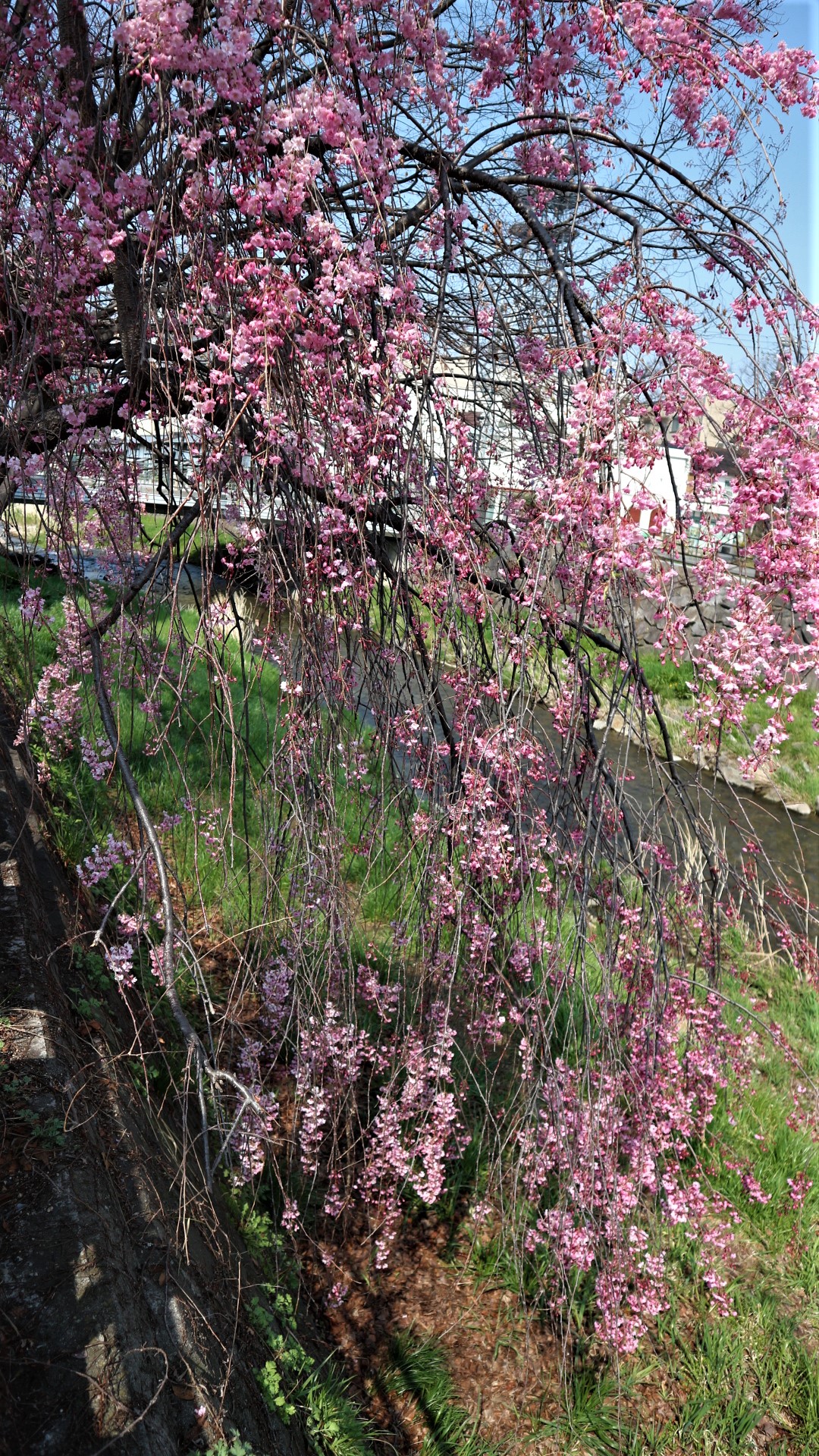一ツ橋の少し上流に毎年気になる色が濃い枝垂れ桜が満開になっていました。