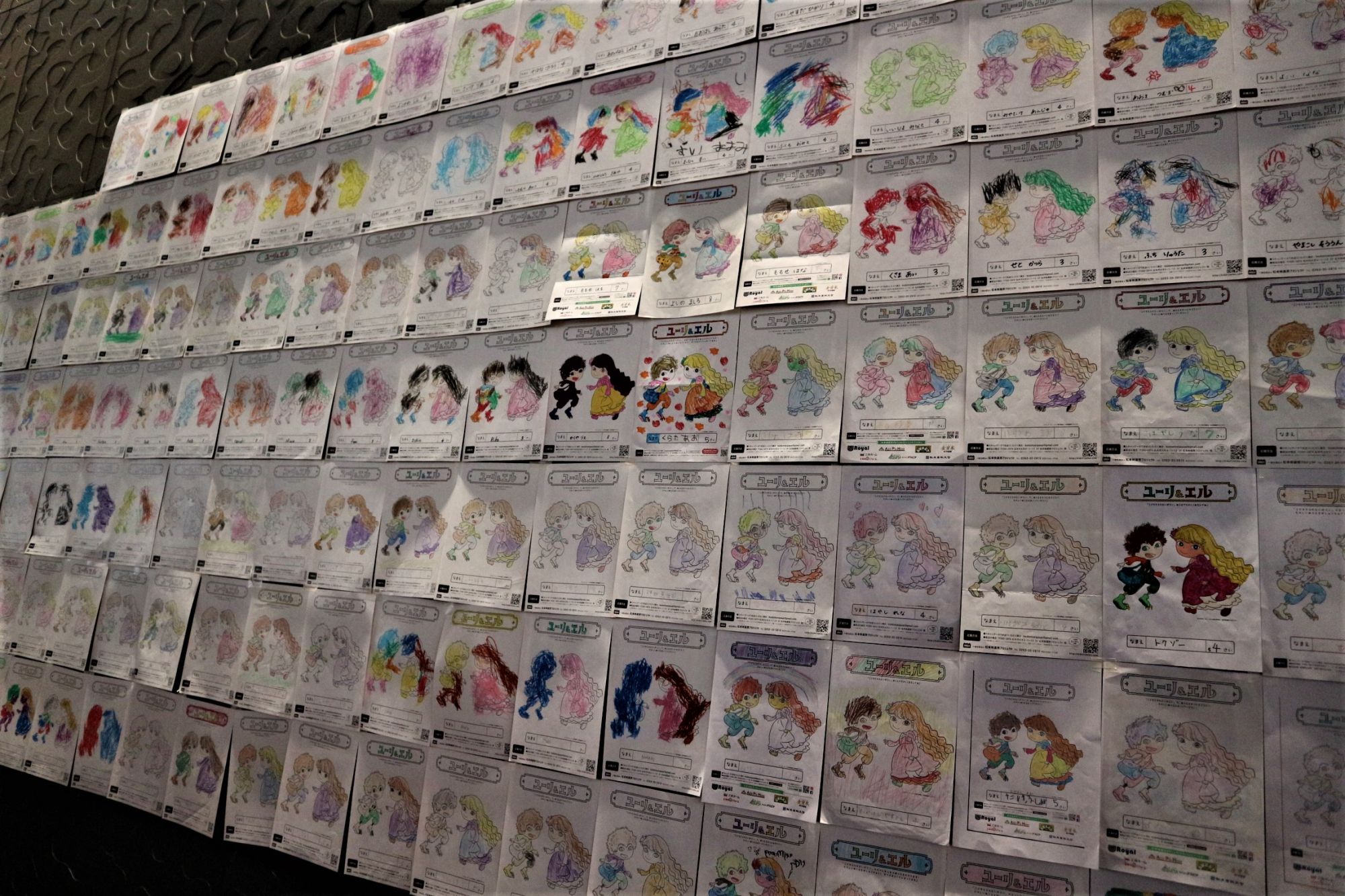 シアターパークの壁一面にユーリとエルのぬり絵が沢山貼られていました。