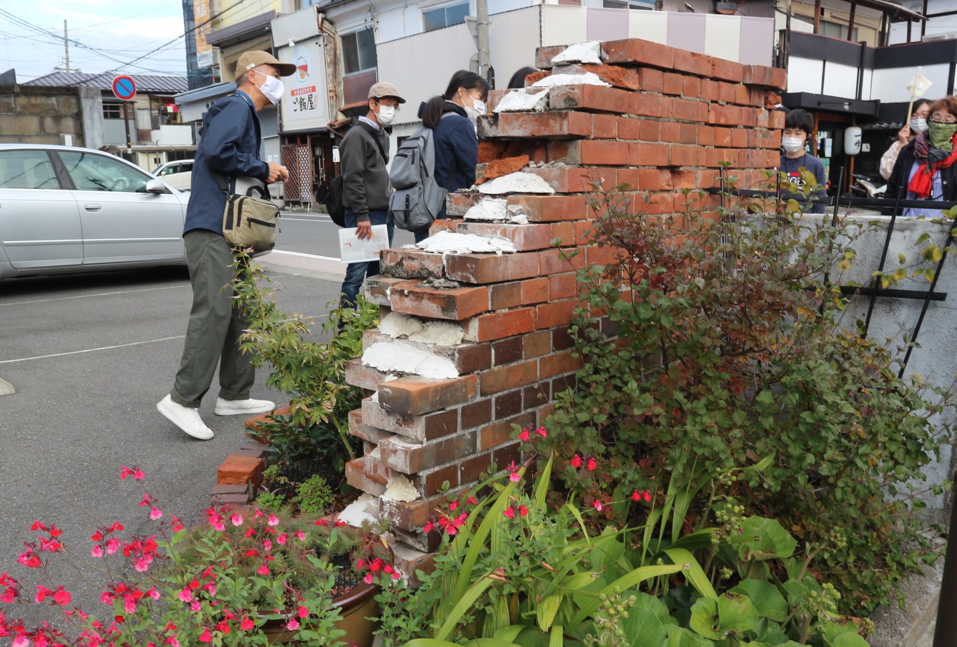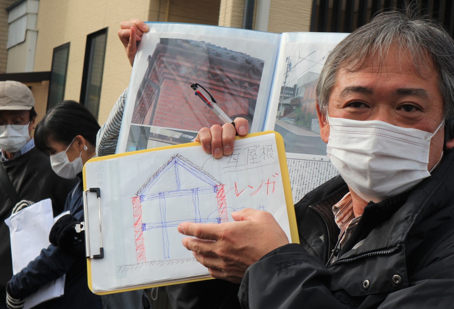 当時の技法はまだ未熟で、先にレンガを積んで、その中に木造建築を入れたので、地震でユラユラ揺れたら中の木造が外に飛び出してしまったのが、壊れた原因だったことを手描きの絵入りでわかりやすく説明して頂きました。