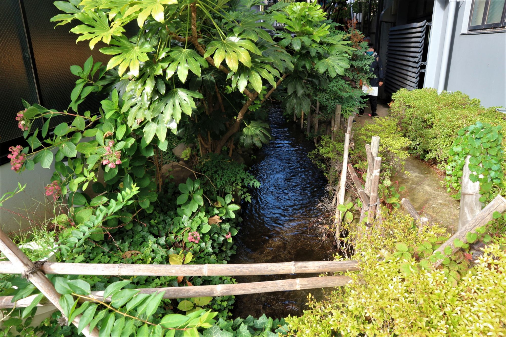 花月から階段を下るここまで暗渠の中を流れてきた水が僅かな時間におひさまの下を流れます。