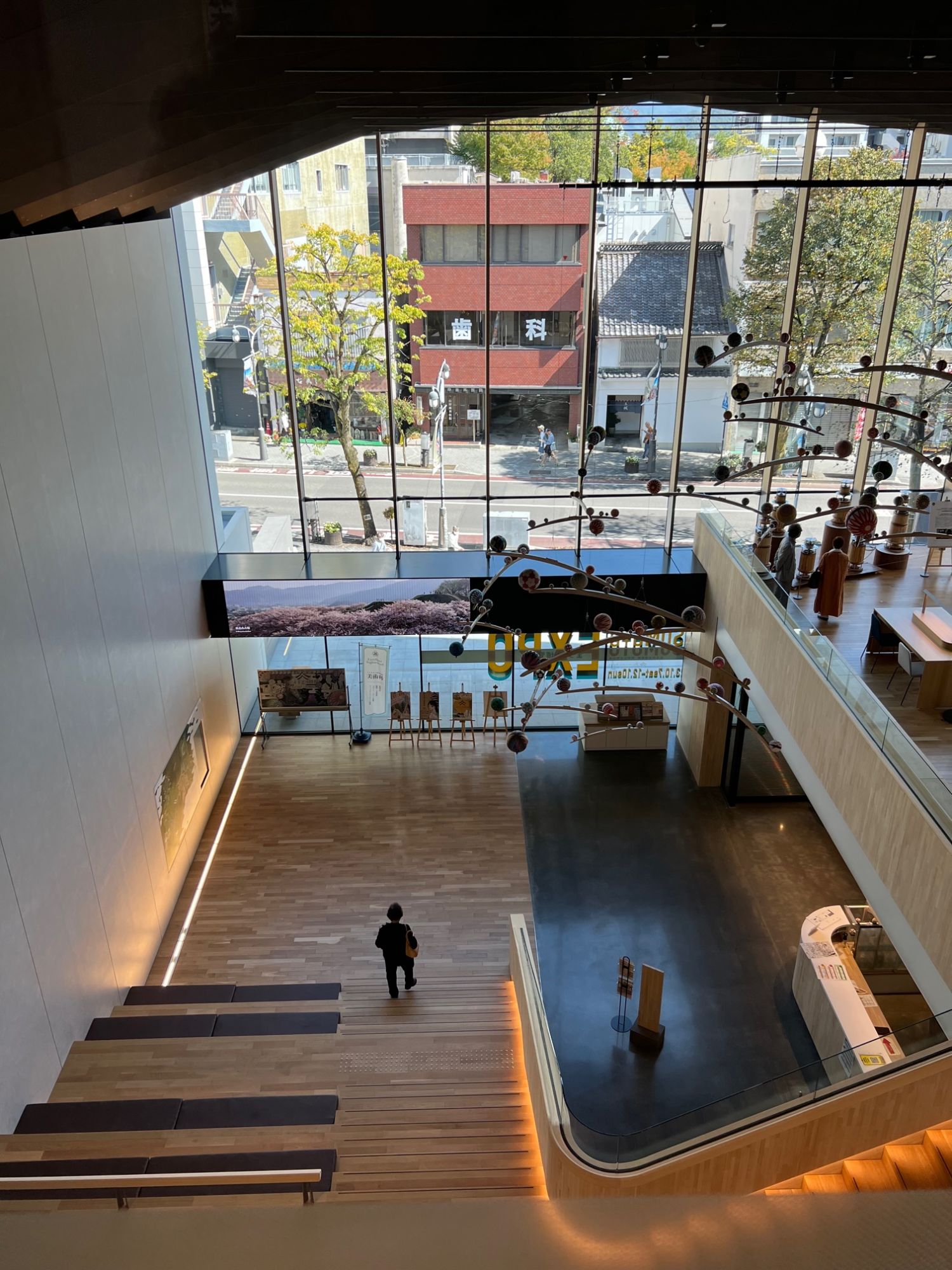 大きな空間があります。壁には、10月7日のオープニングイベントで書かれた蟻ケ崎高校書道部の書が展示されています。