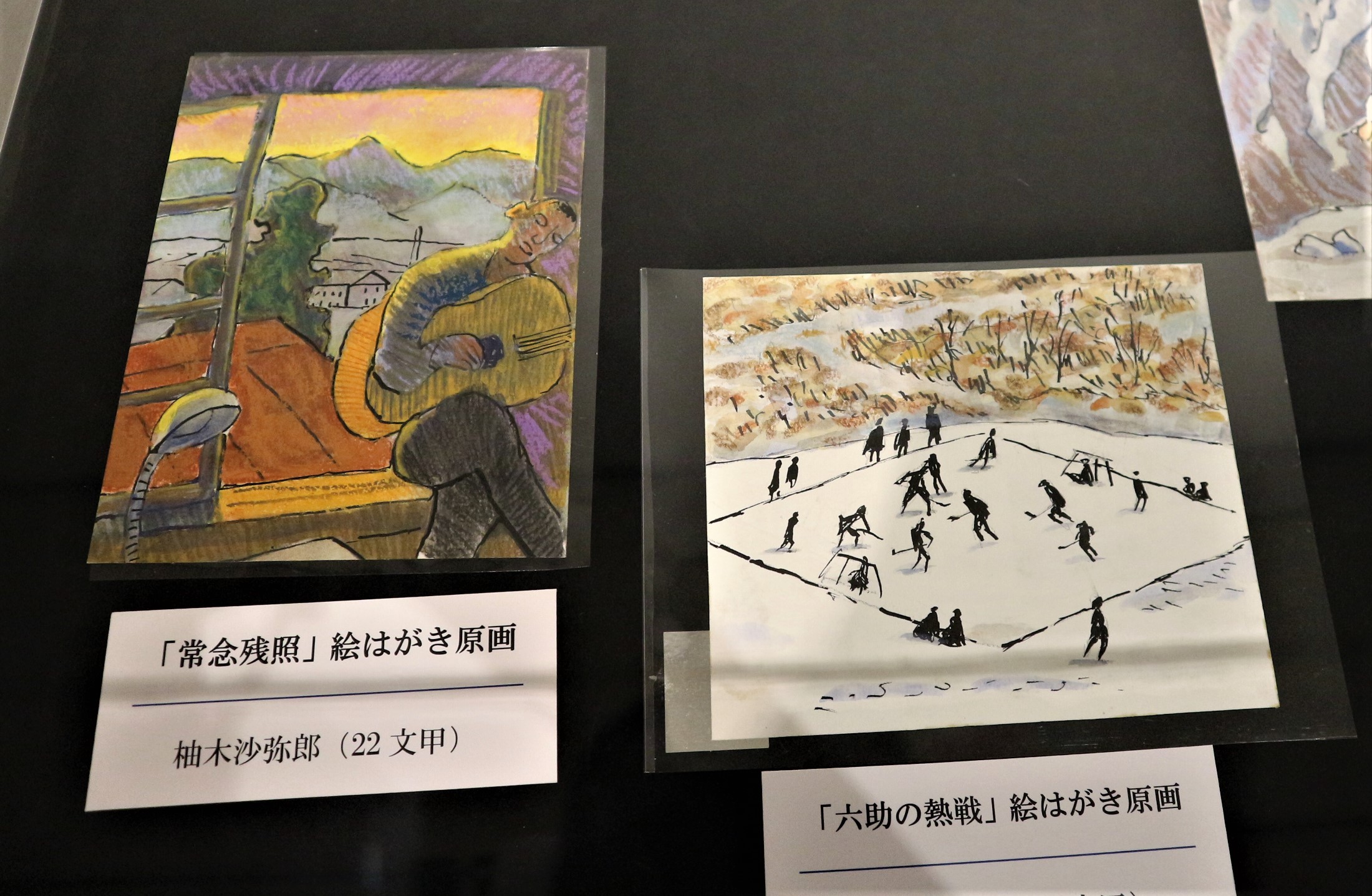 旧制松本高等学校に通われていた版画家の柚木 沙弥郎(ゆのきさみろう)さんの絵葉書の原画も展示されています。