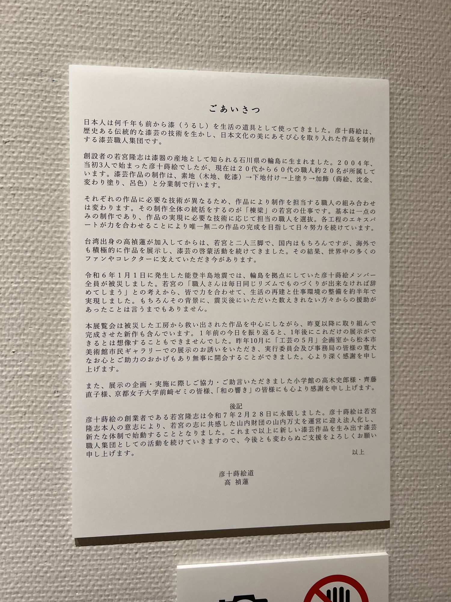 昨年、震災と水害の二重被害となった輪島を拠点とする漆芸職人集団「彦十蒔絵」の手しごとを紹介する展覧会。