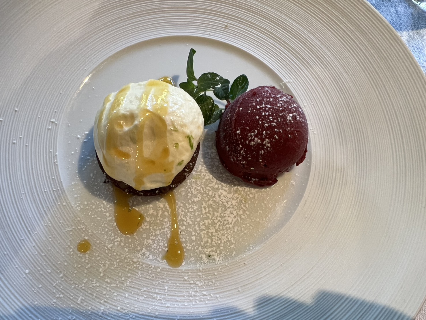 デザート チョコレートケーキハーブクリーム炭酸入りソースかけとカシスのシャーベット