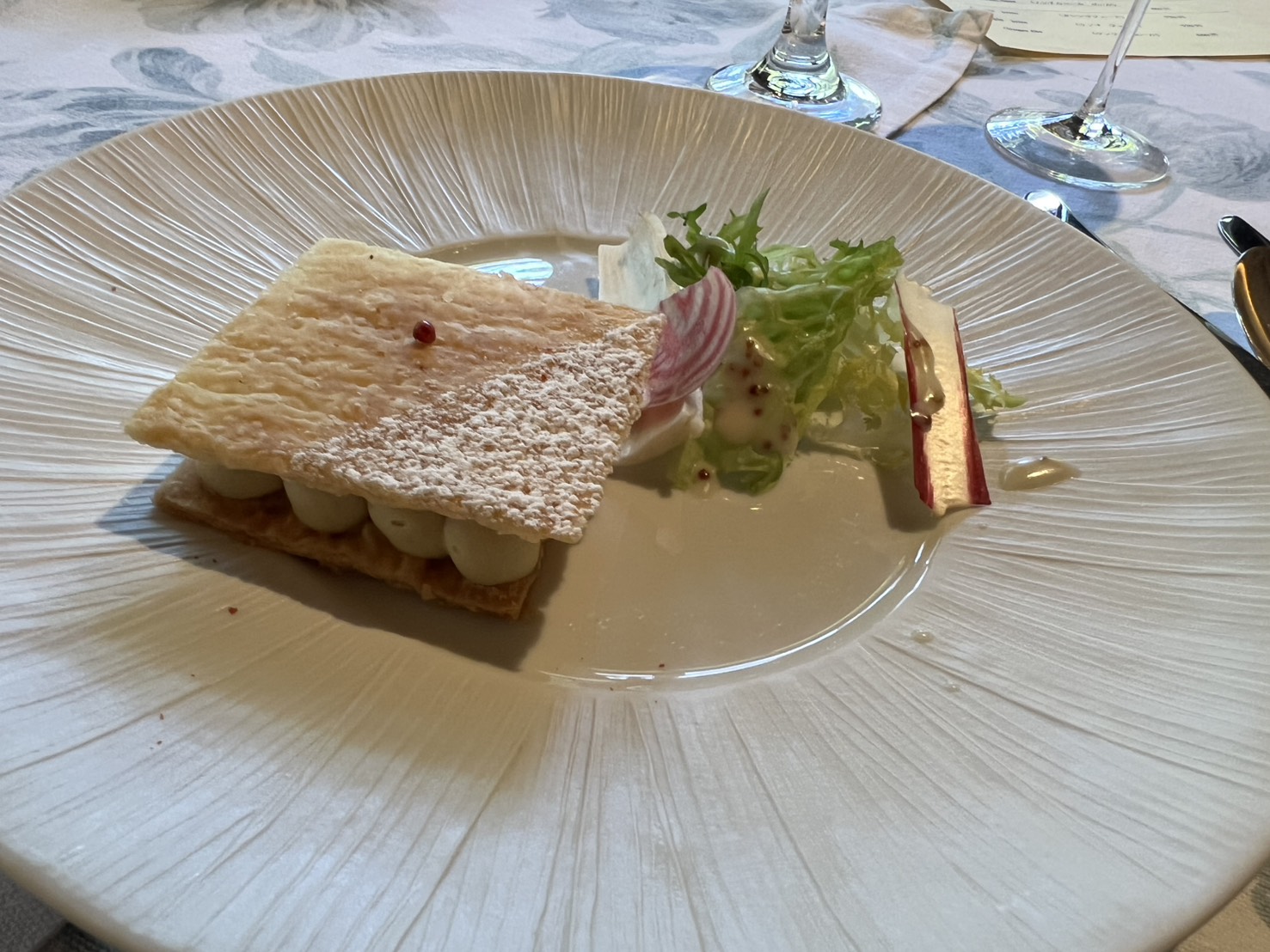 前菜 フォアグラのミルフィーユと蛤のタルタルソースとサラダ