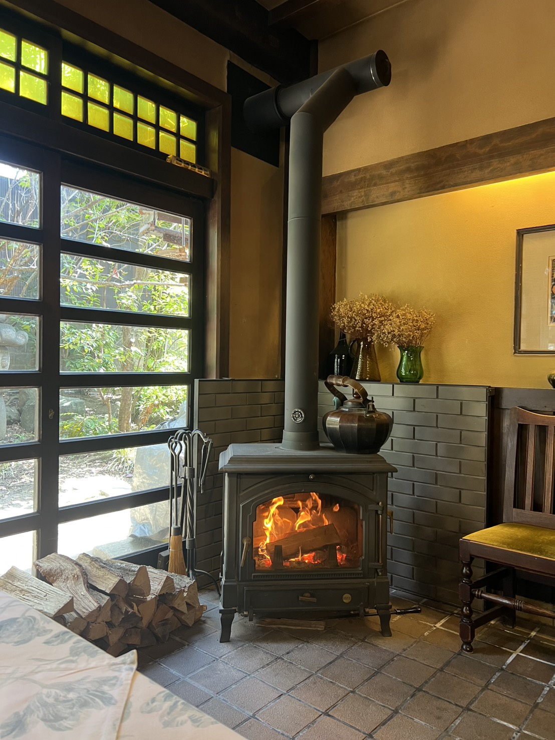 テーブルの横では、暖炉に火が焚かれ広い店内を優しく暖めてくれています。