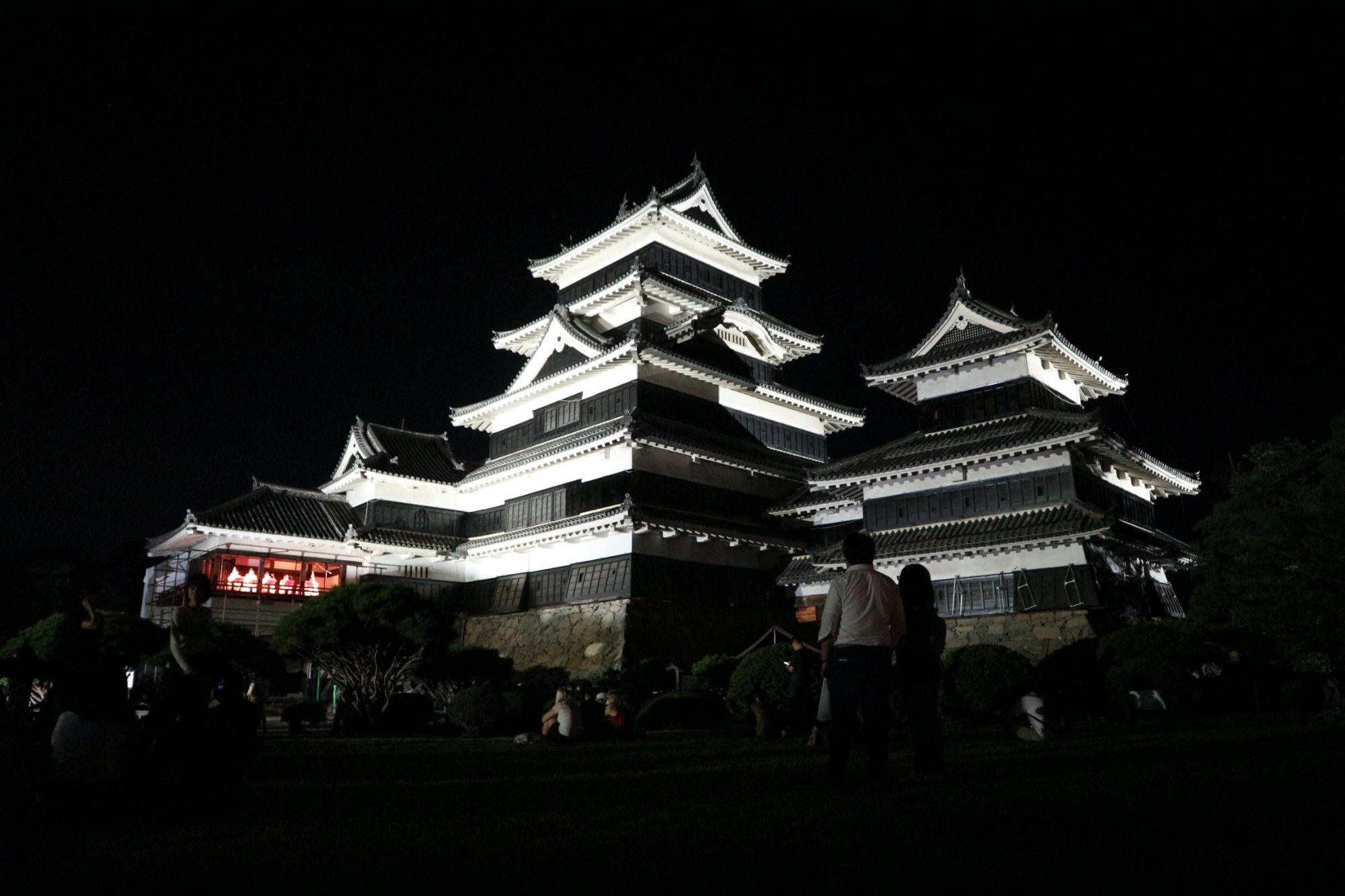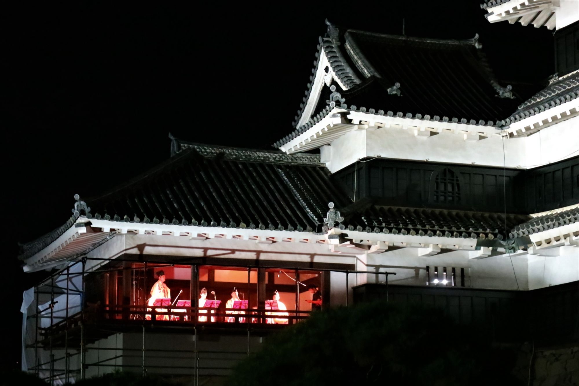 松本城の月見櫓では、雅楽の演奏がおこなわれ特別席や芝生に座り演奏を思い思いに楽しんでいました。