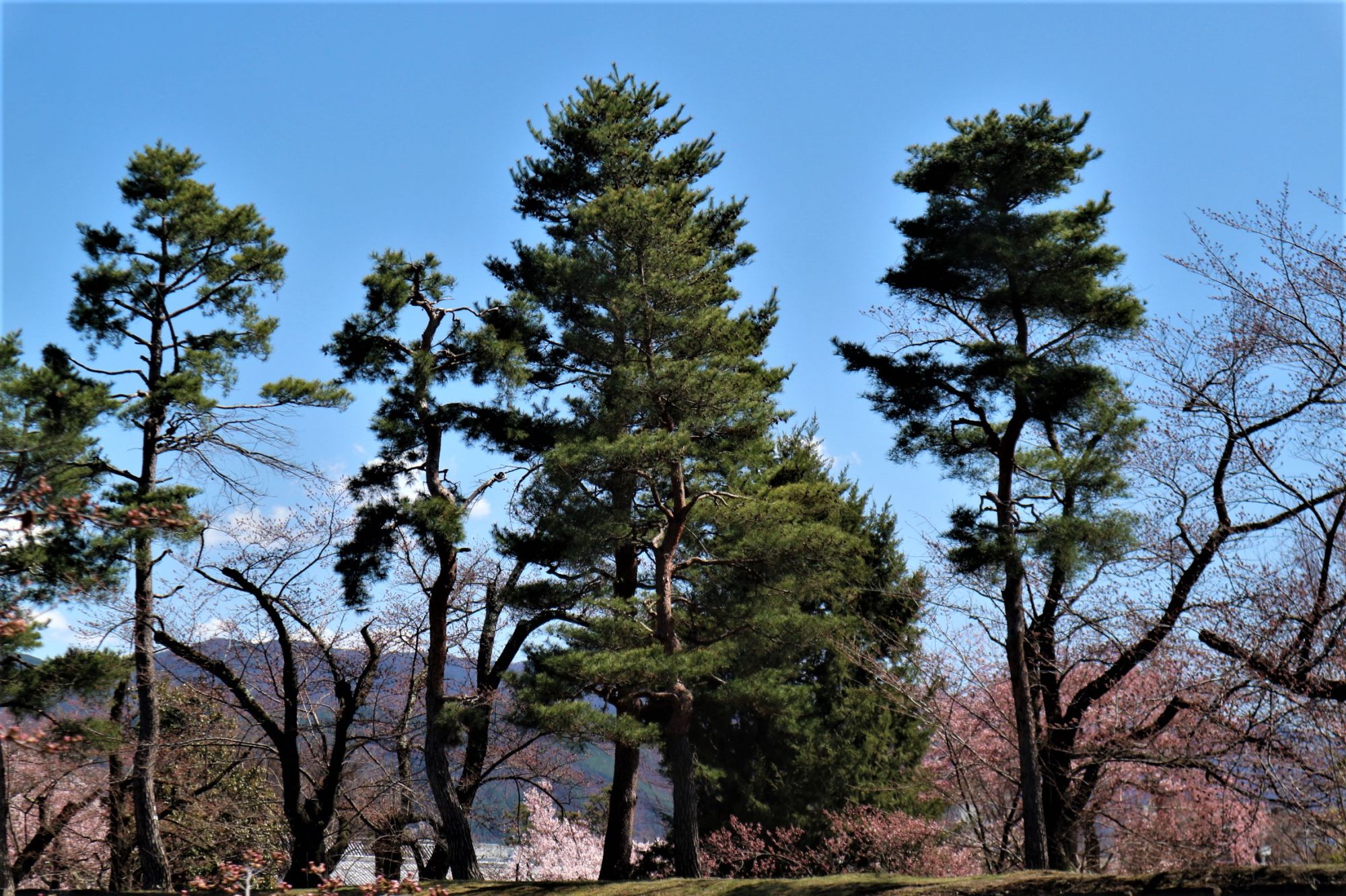 外堀から本丸庭園内を眺めるとコヒガンザクラ、枝垂れ桜が咲いているのが見えます。