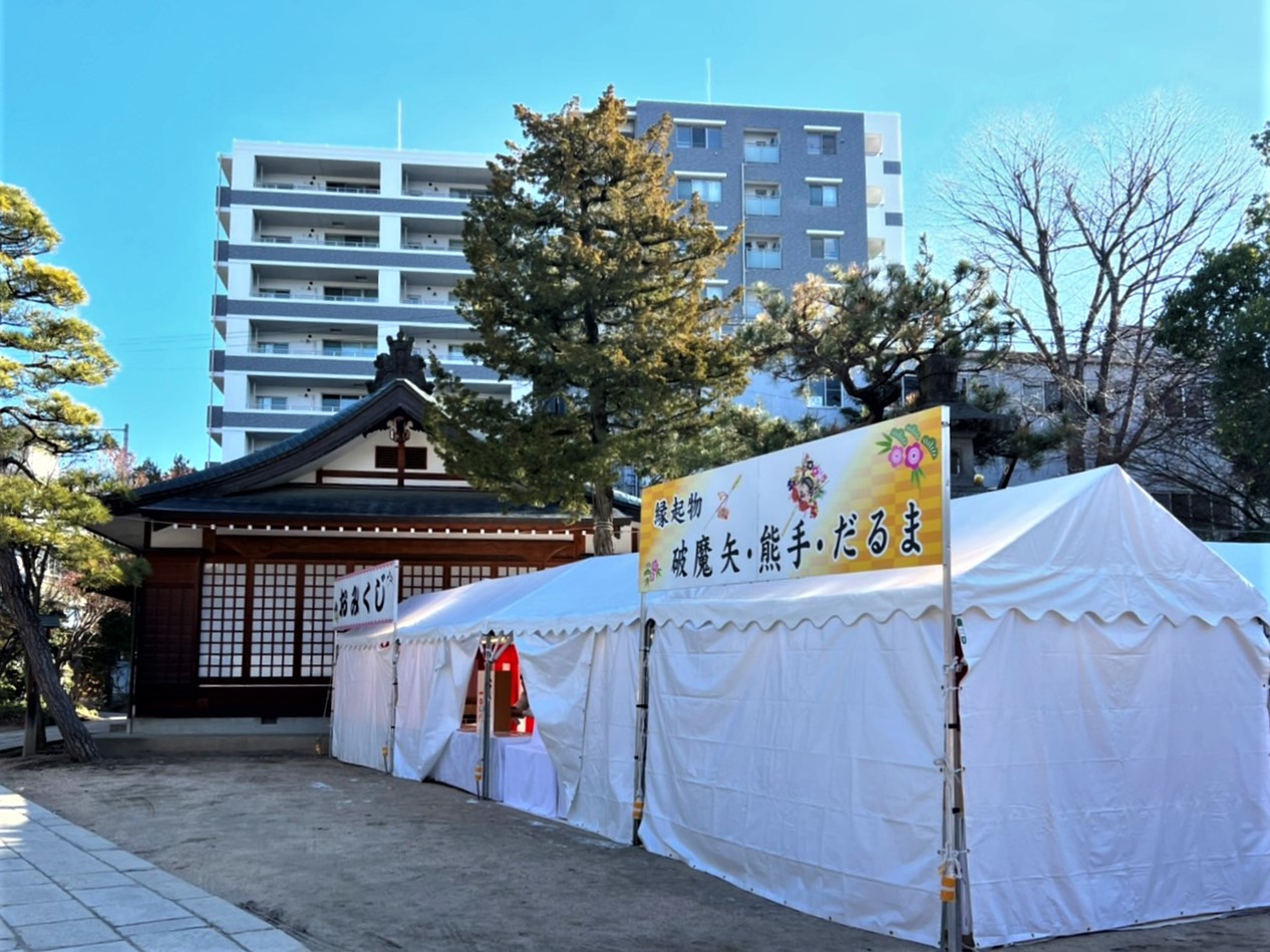 お神酒の振る舞いもあり、小学生以下には先着順でおもちゃを配り、希望者には「蘇民将来」と書かれた疫病退散のお札を配布する。