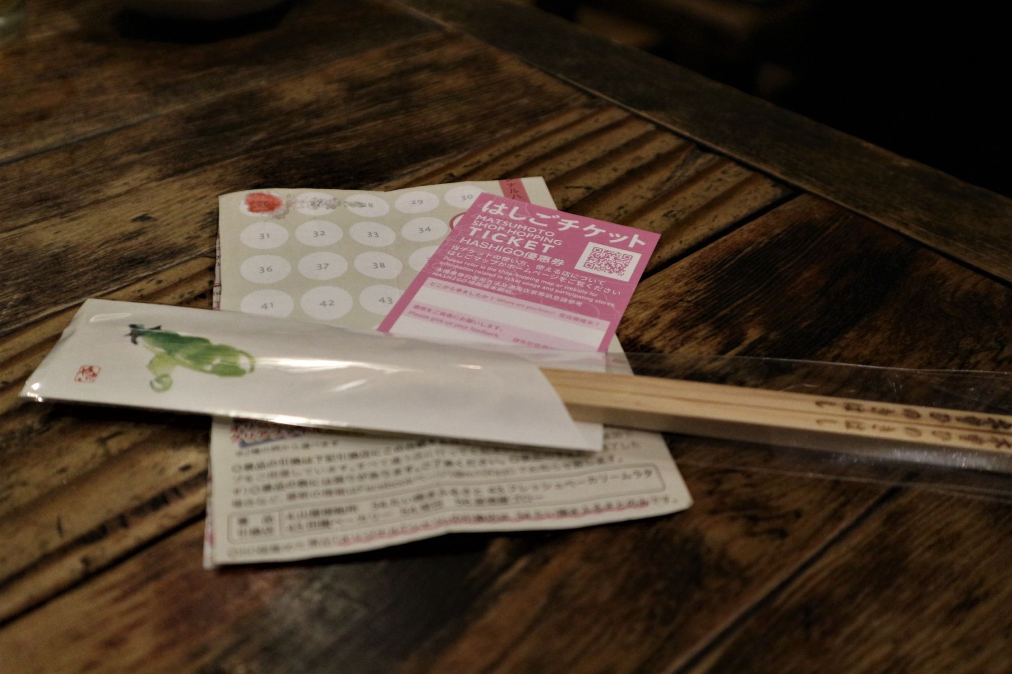 はしごチケットのサービスは、木曽王滝村産桧材手造り割り箸一膳を頂けます。