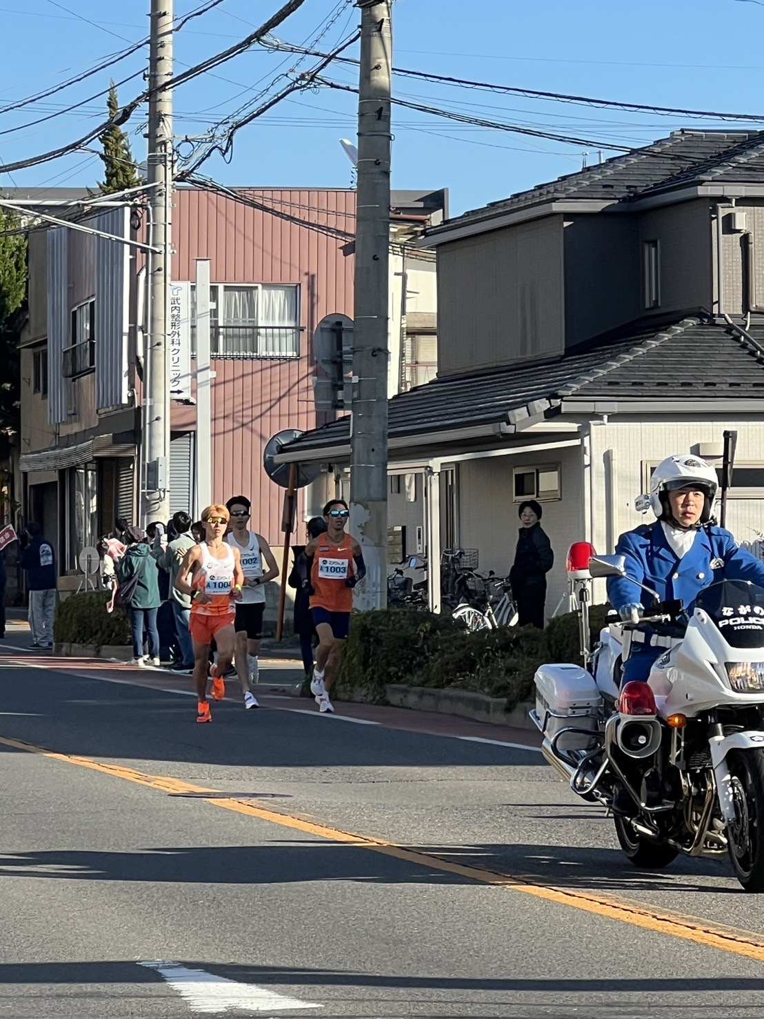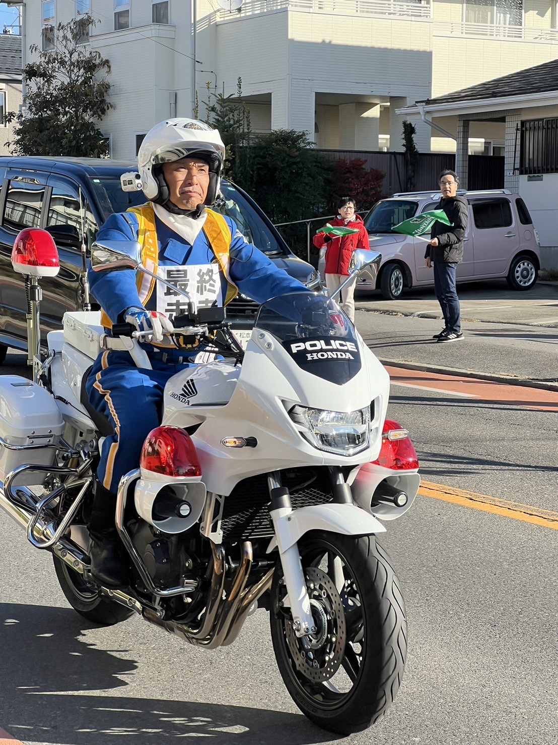 最終走者の後ろを走るのは、白バイの警察官さん