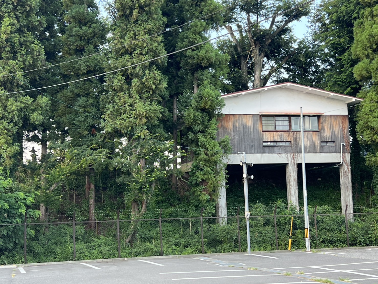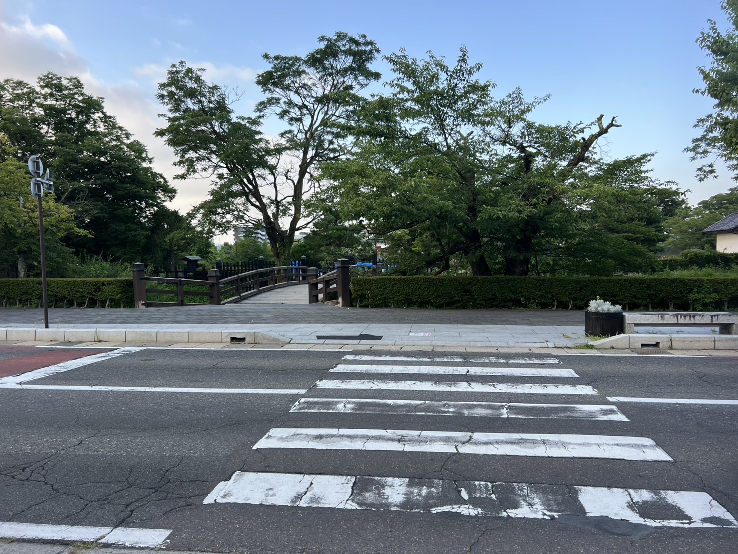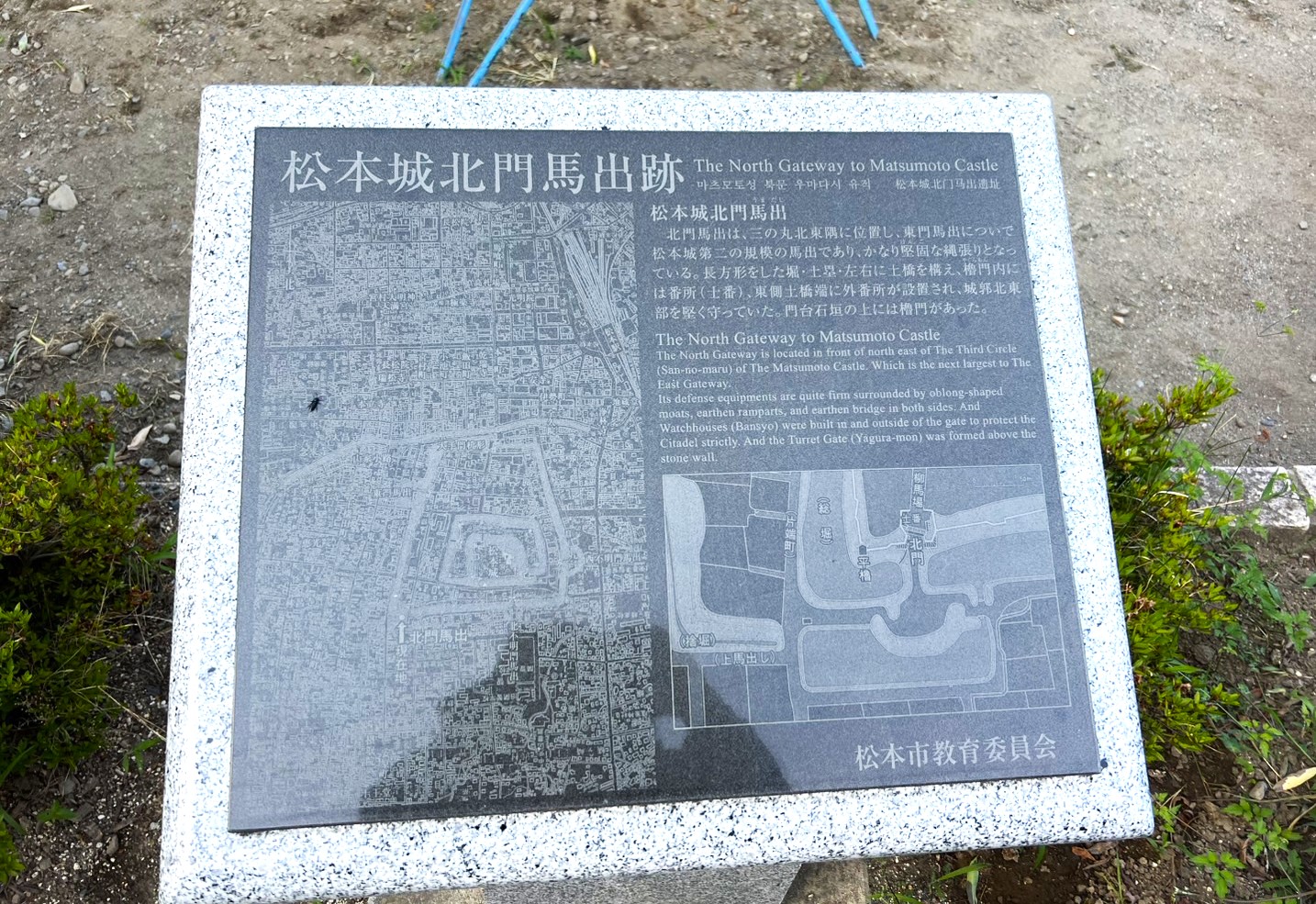 その隣の駐車場の奥には、松本城土塁跡が見えます。