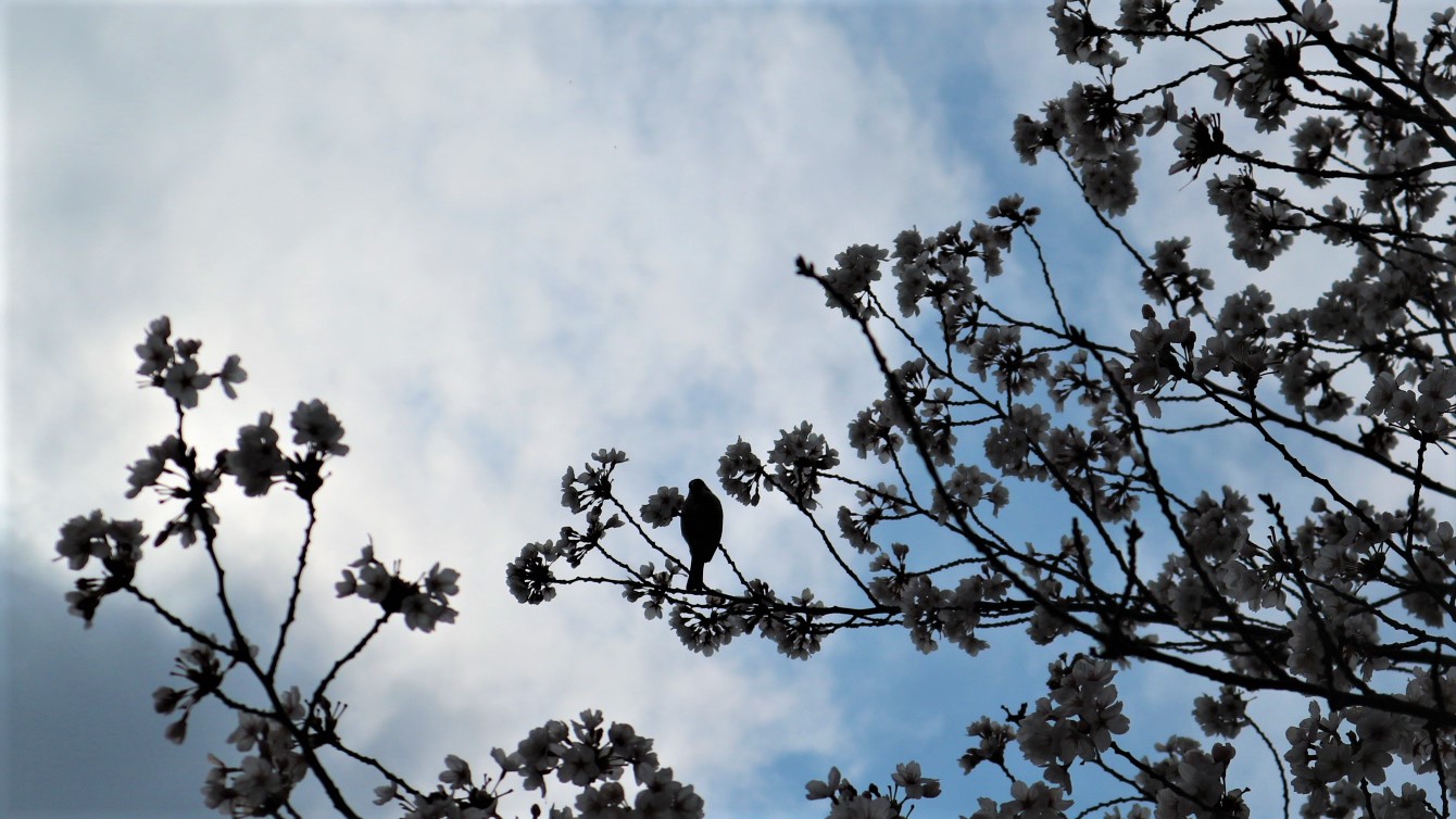 雀が桜の花を突っついて落として遊んでいるように見えました。すべての木ではなくお気に入りの木を集中して落としていました。