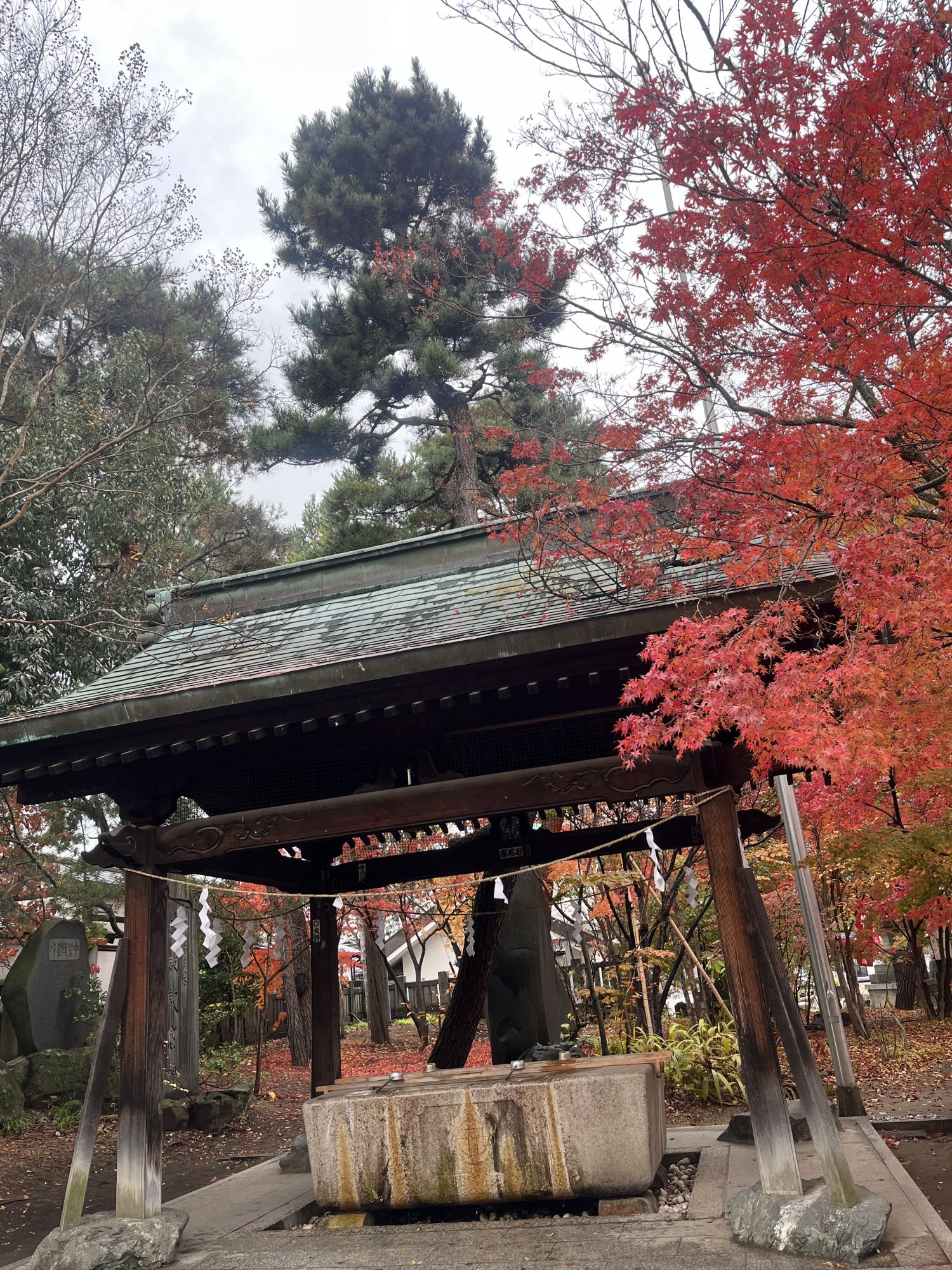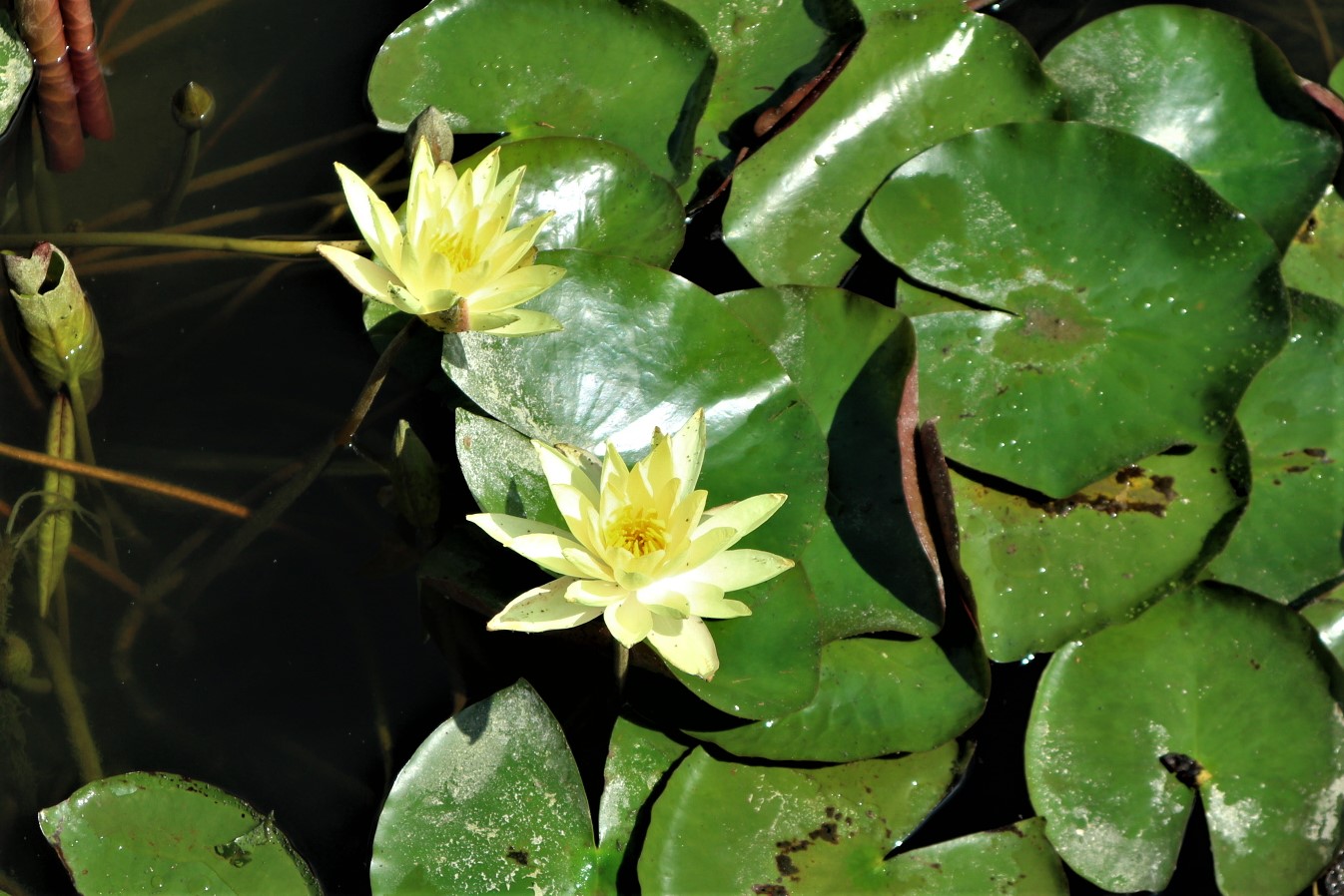 埋橋(赤い橋)の前にある蓮池 睡蓮の花が咲いていました。