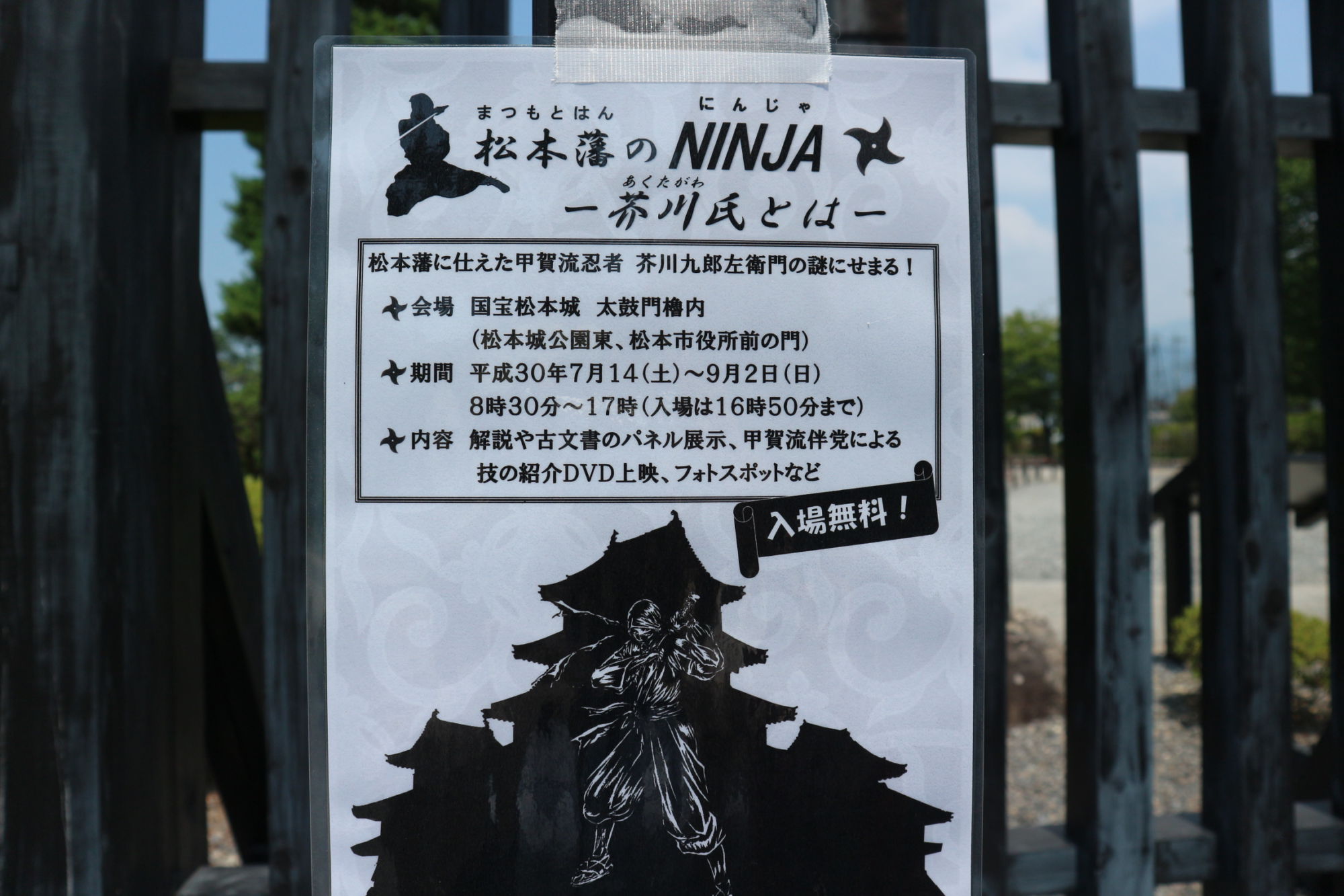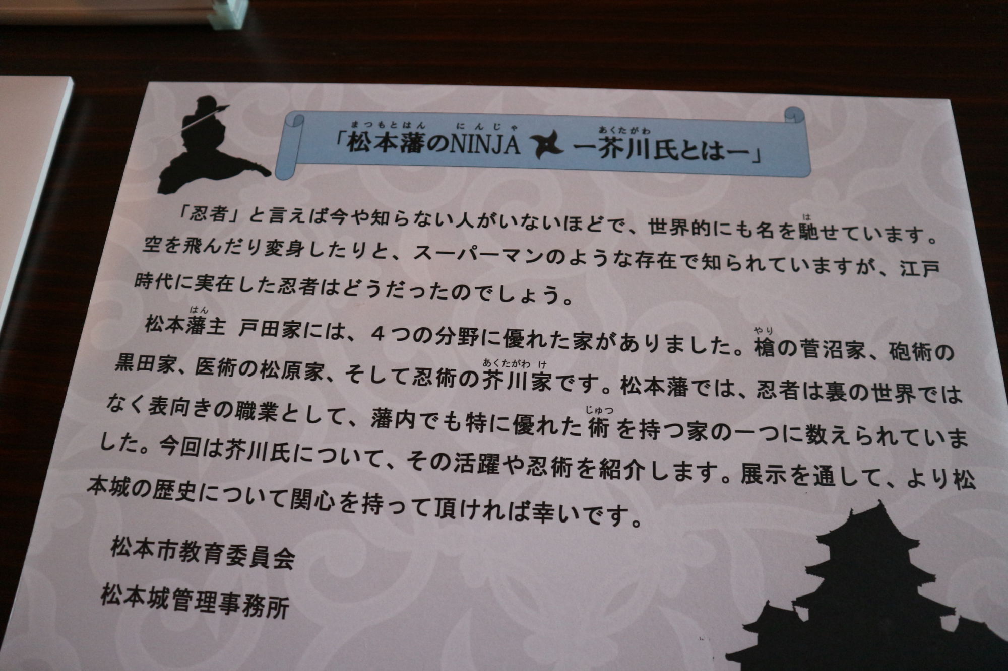 松本藩に仕えた甲賀流忍者芥川氏について、その活躍や忍術についてパネル展示しています。