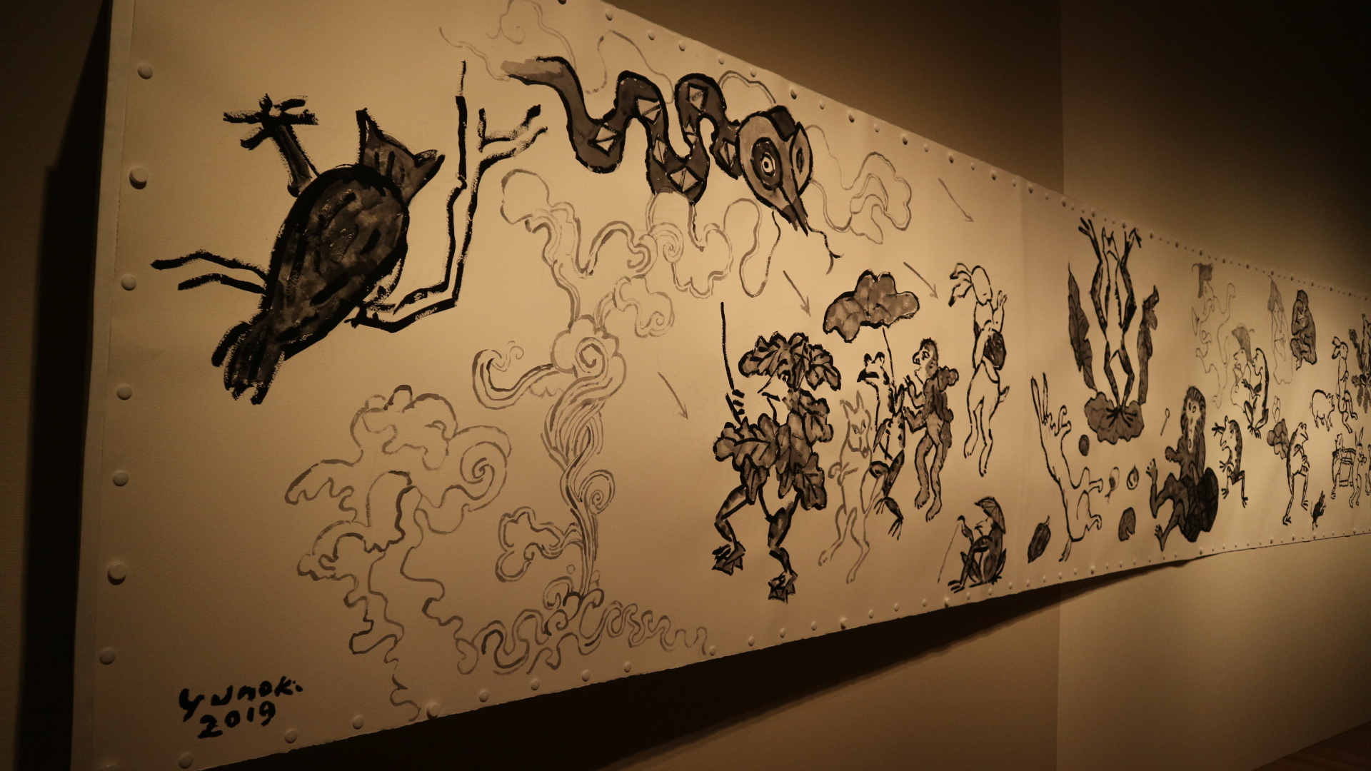 昨年制作されたばかりの大作です。柚木流の鳥獣戯画 生き物たちが楽しそうで、特に沢山描かれている蛙は愉快で可愛いです。