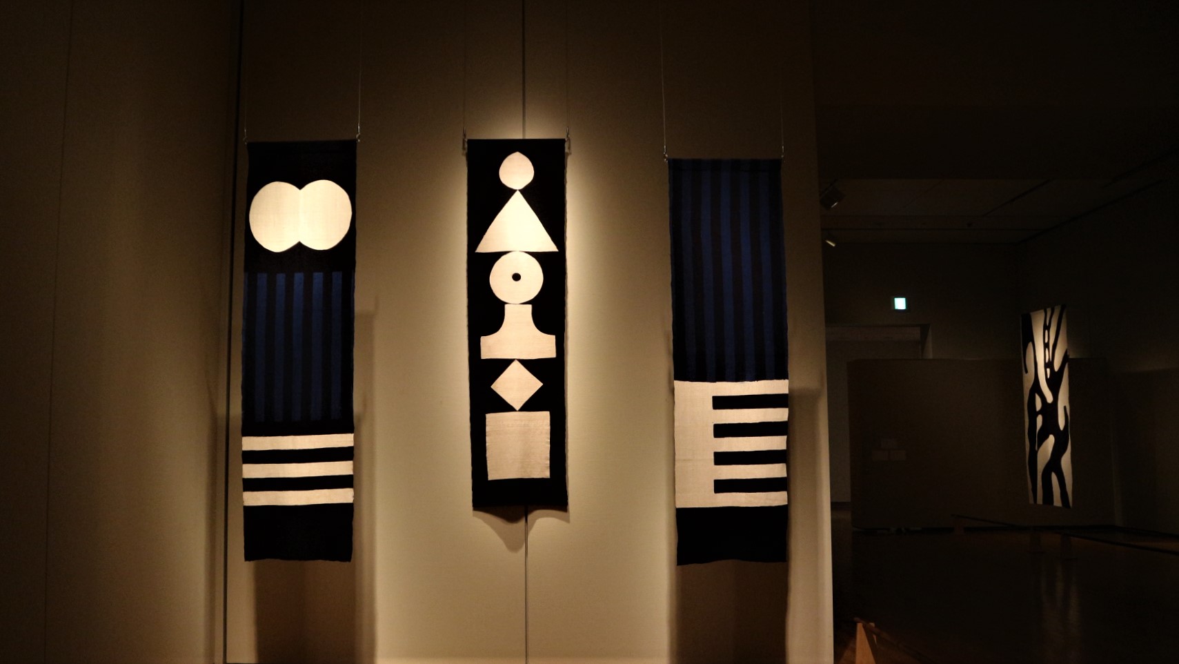 中央の作品は「幕」1950年 型染・木綿 坂本善三美術館所蔵
