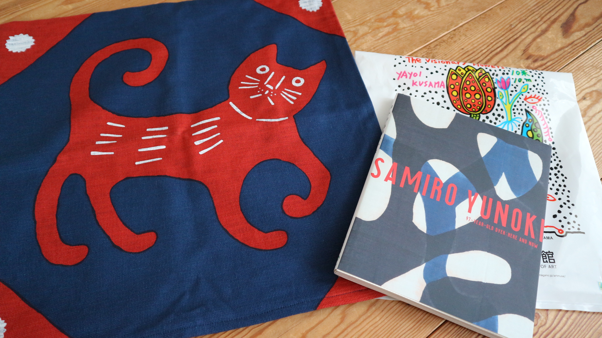 今回は、身近に柚木沙弥郎さんを感じたいので、図録(2200円税込み)とクッションカバー(6820円税込)を購入しました。