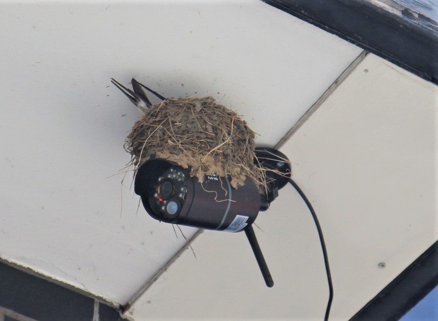 お店の入口の上に設置している防犯カメラの上の僅かなスキマにツバメが巣を作っていました。