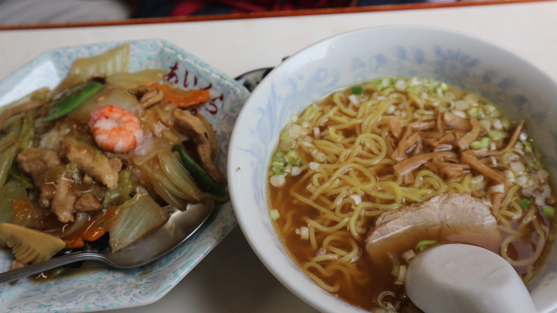 4人で食べたのは、五目ラーメン950円、半ラーメン半中華丼セット1,200円、五目かた焼きそば、半チャーハン