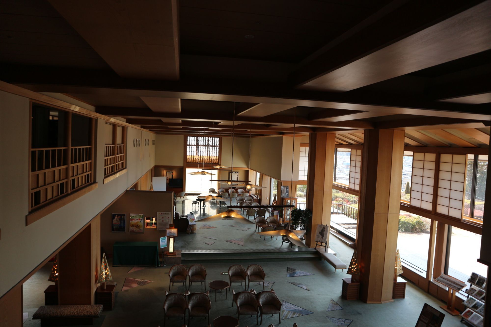 中に入ると広くて豪華なインテリアのロビーそしてテラスの向こうには、