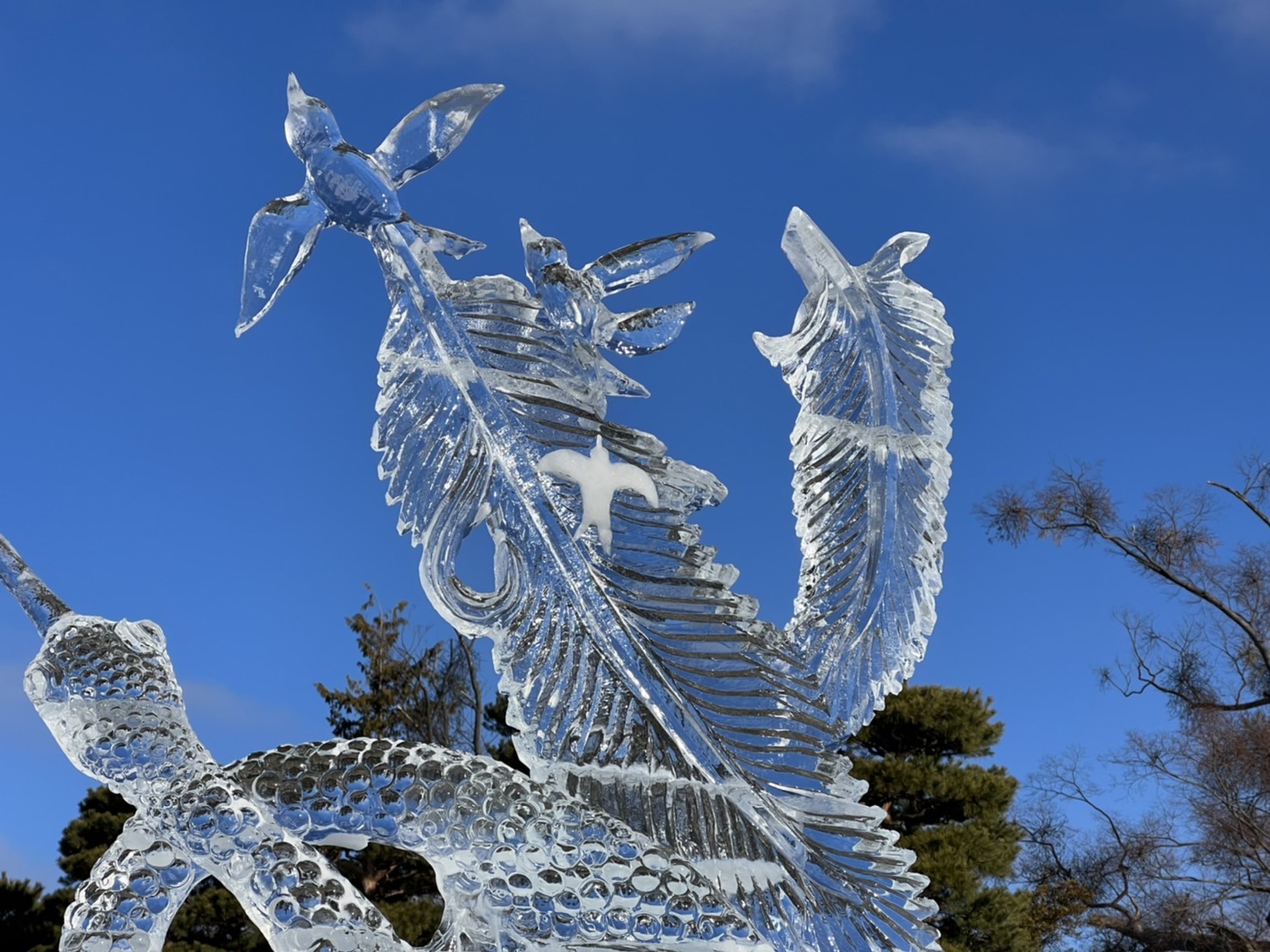 真冬の青空の下 大勢の人が氷彫フェスティバルを楽しんでいました。