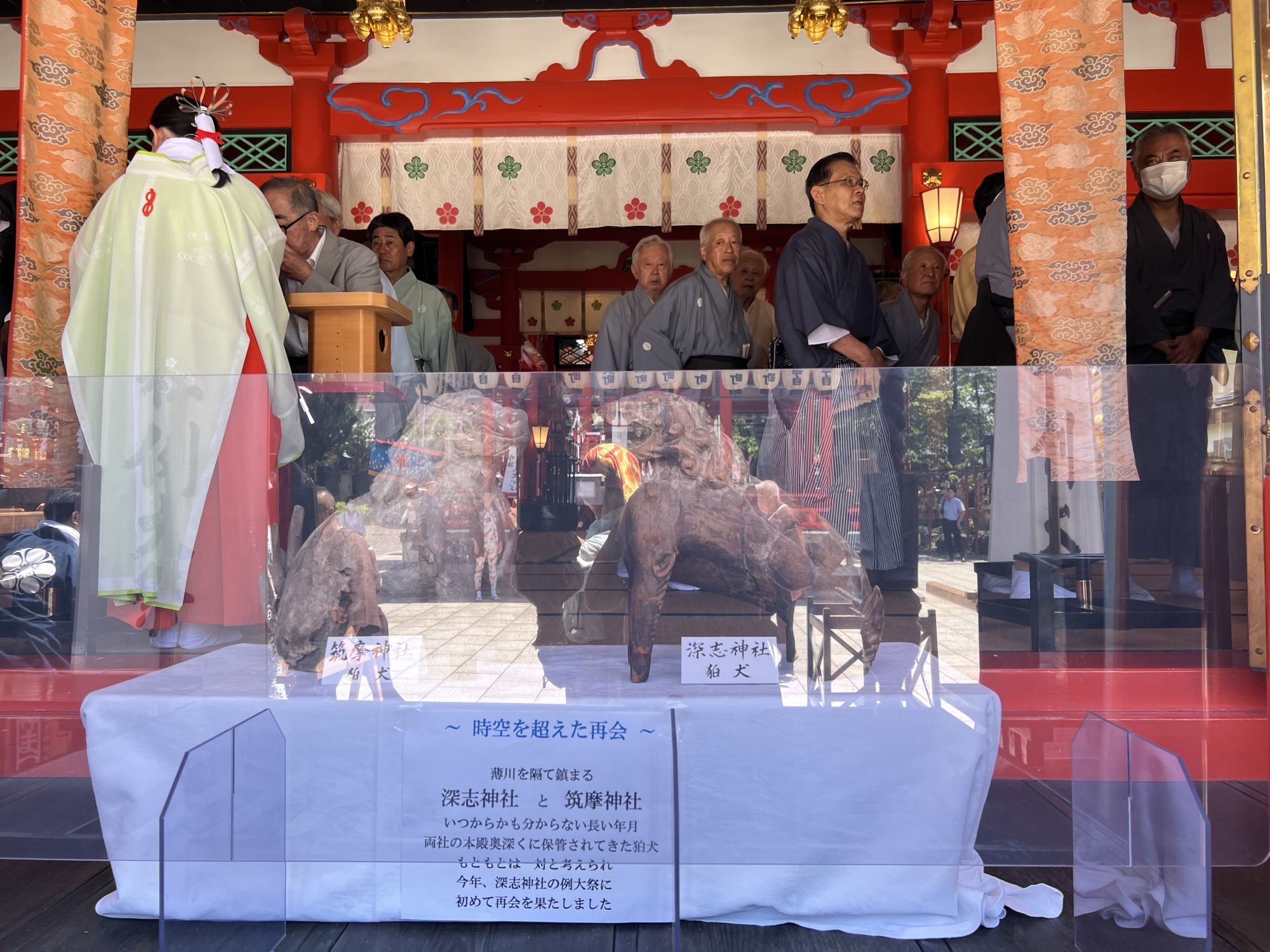 深志神社と筑摩神社にそれぞれ1体ずつ保管されていた狛犬が、24日25日と短時間深志神社の天神祭りで拝殿前に並べて展示されていました。