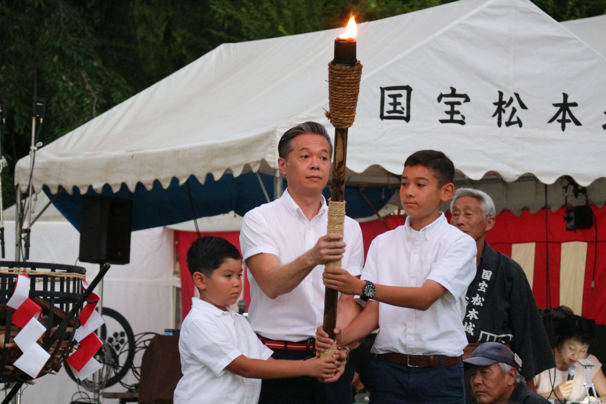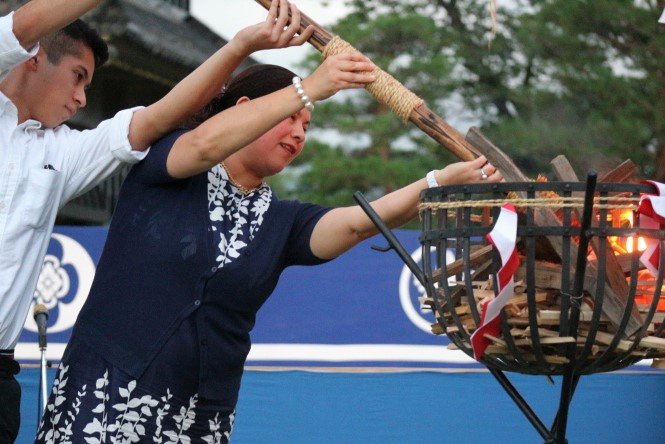 松本市に在住のスペイン人のご一家の皆さんが、巫女さんより火を受け取りかがり火に点火されました。