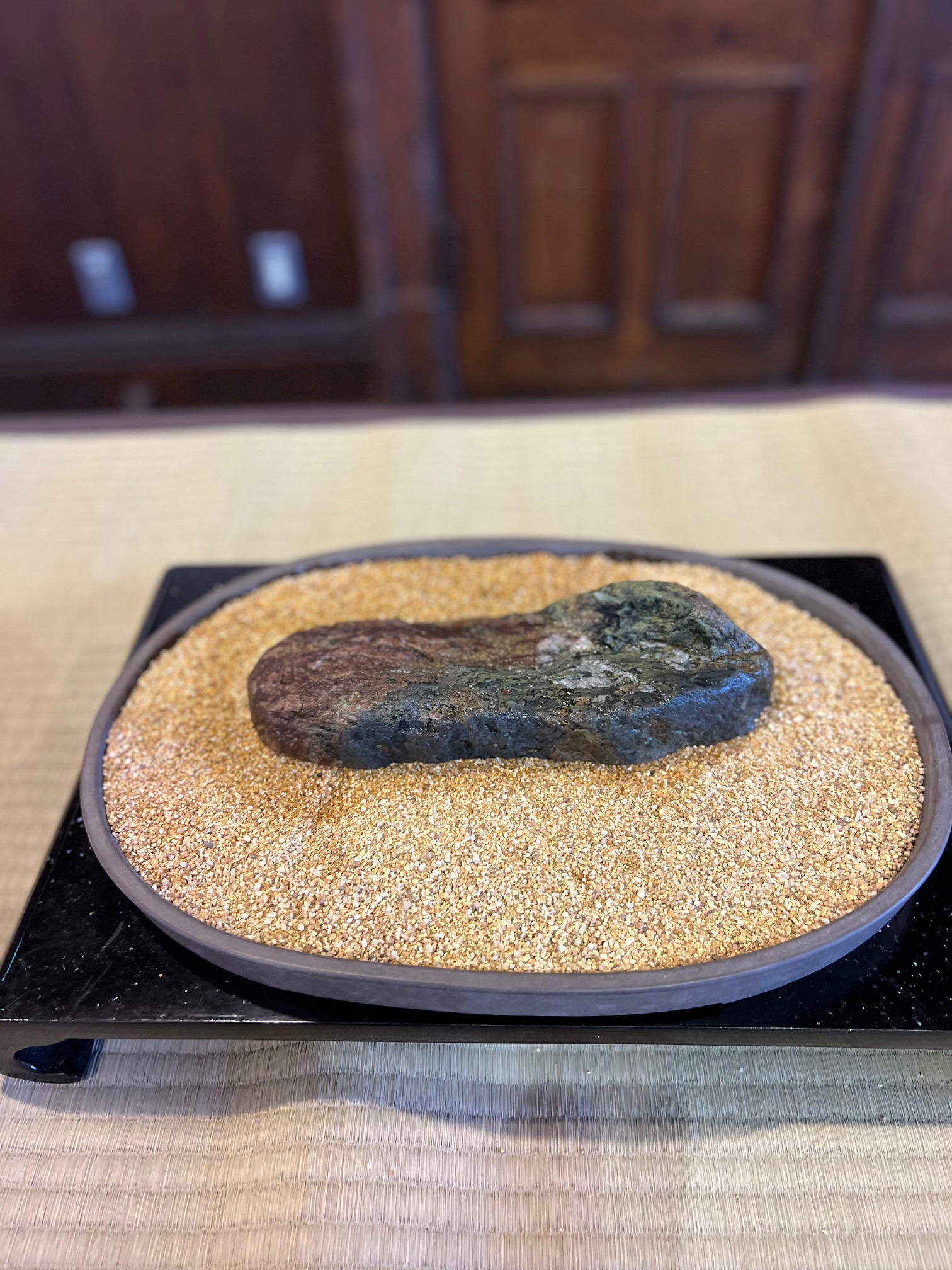 自然石を台座、または水盤に砂をしいて配置して室内で鑑賞する日