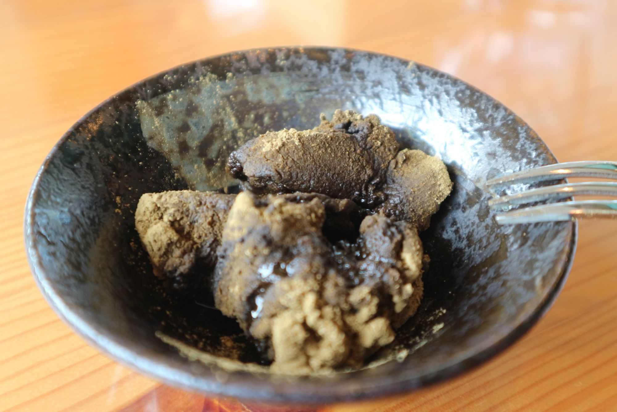 きな粉に黒蜜シロップがかかったモチモチのデザート