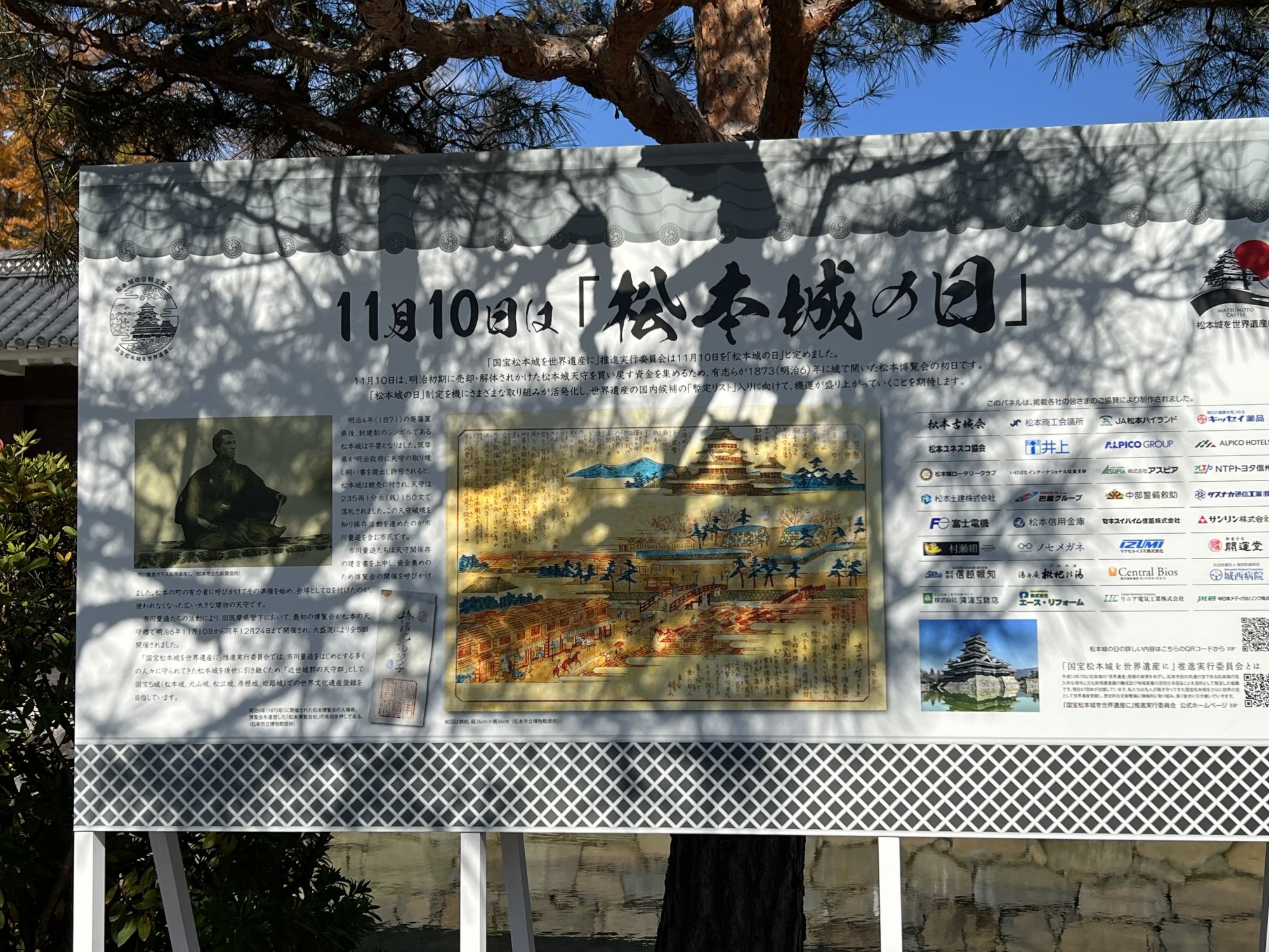 紅葉真っ盛りの松本城 今年から11月10日を「松本城の日」と制定しました。 この日は1873(明治6)年、市川量三が天守保存のために開催した「第1回松本博覧会」の初日。 松本祭り開催の11月3日(文化の日)から10日(松本城の日)に、国宝松本城 Weekを開催中です。