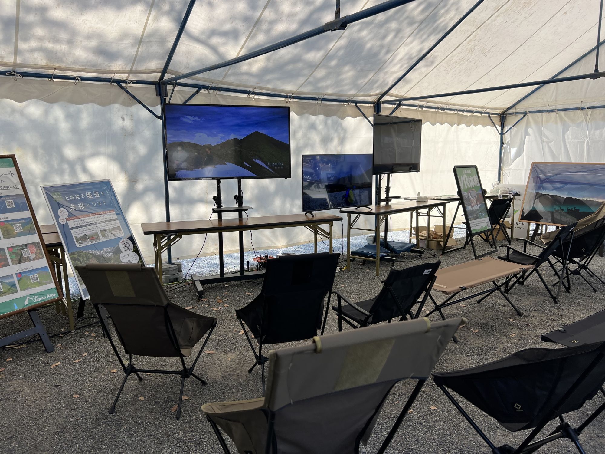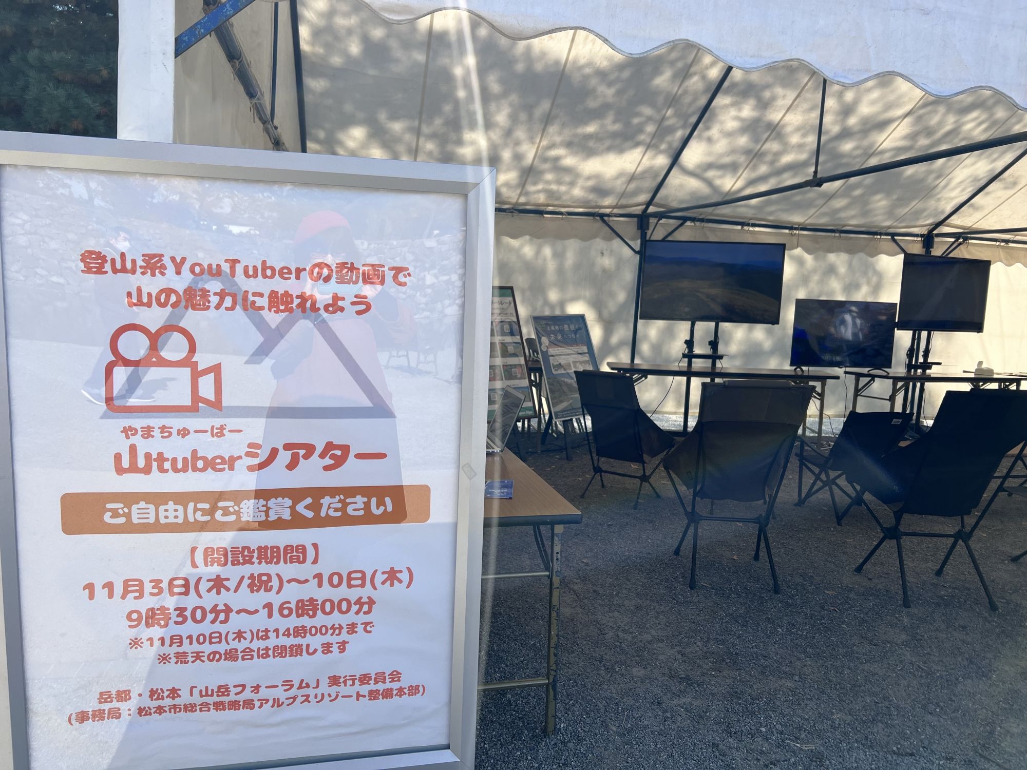 山Tuberシアター 登山系のYouTuberの動画で山の魅力に触れるブースです。アウトドアメーカーとコラボして提供してもらった椅子に座りながら山の映像を楽しめるブースです。