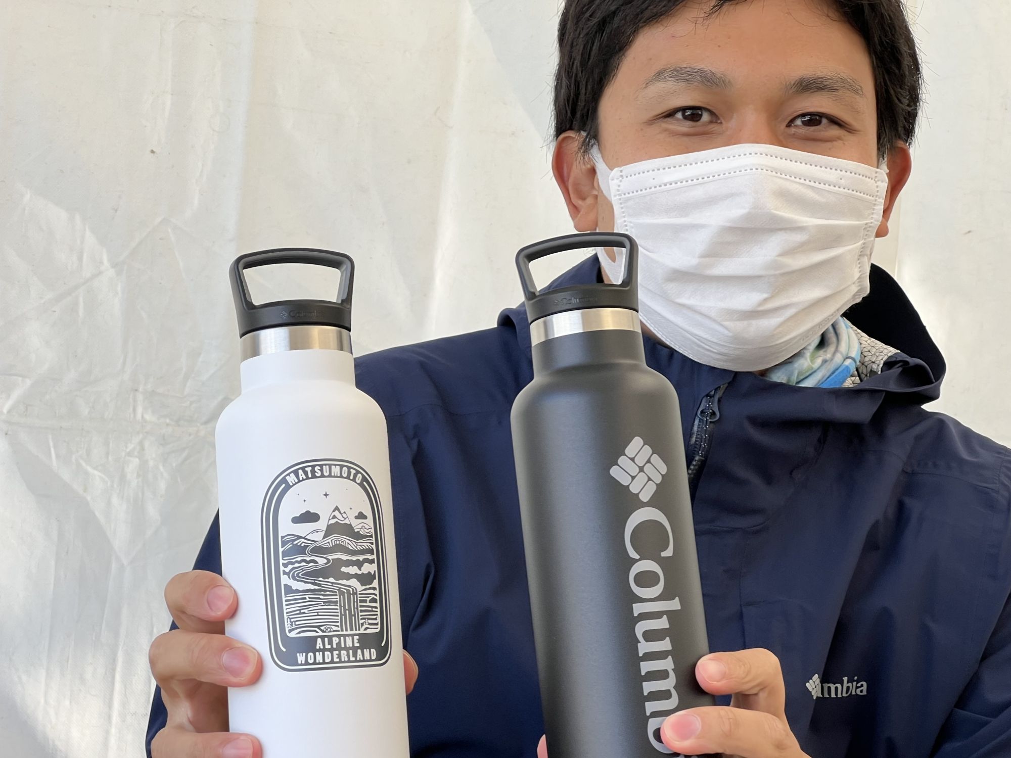 手に持っているオシャレなボトルは、松本市とアウトドアメーカーコロンビア社と協働で作ったボトルを紹介してもらいました。