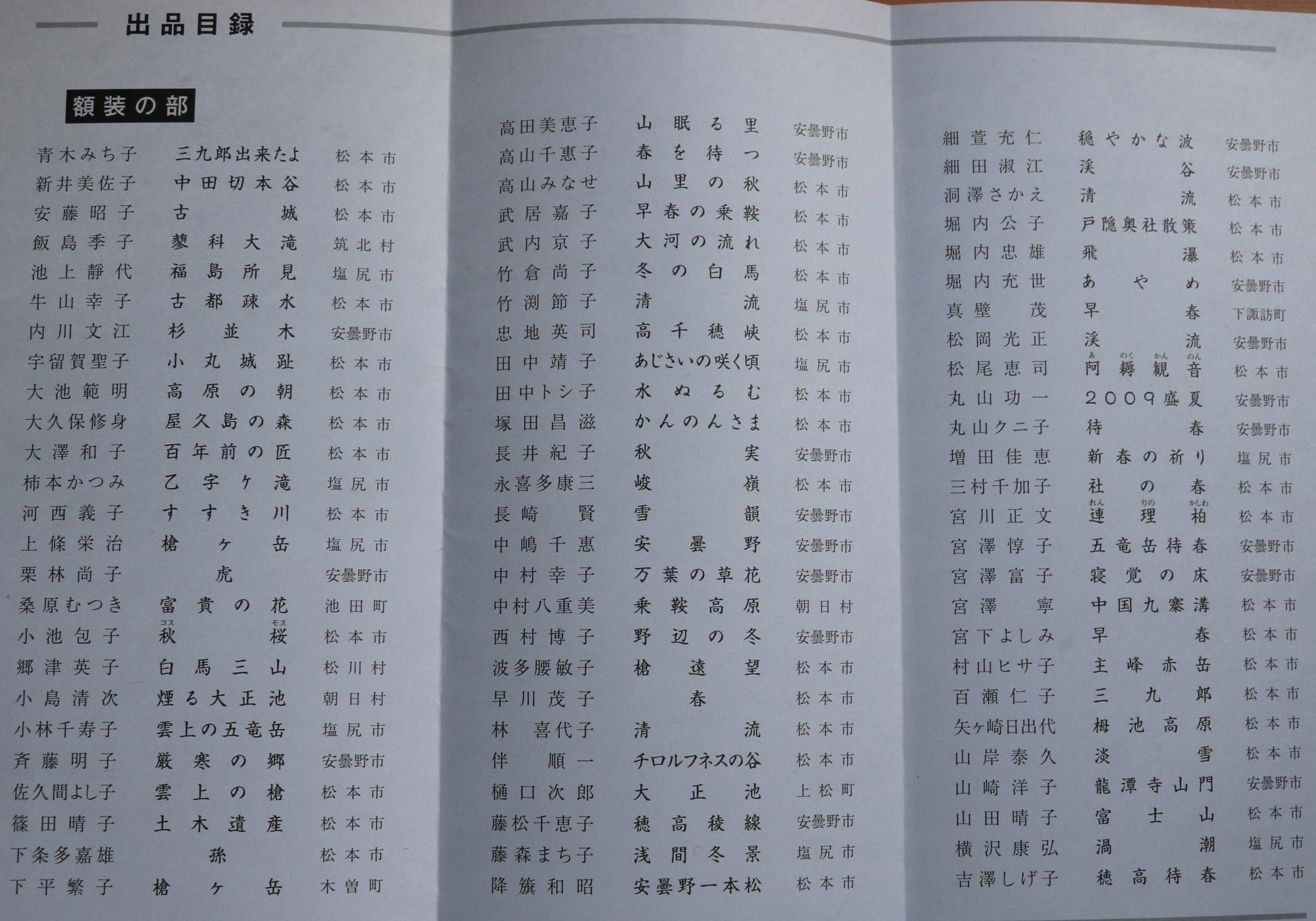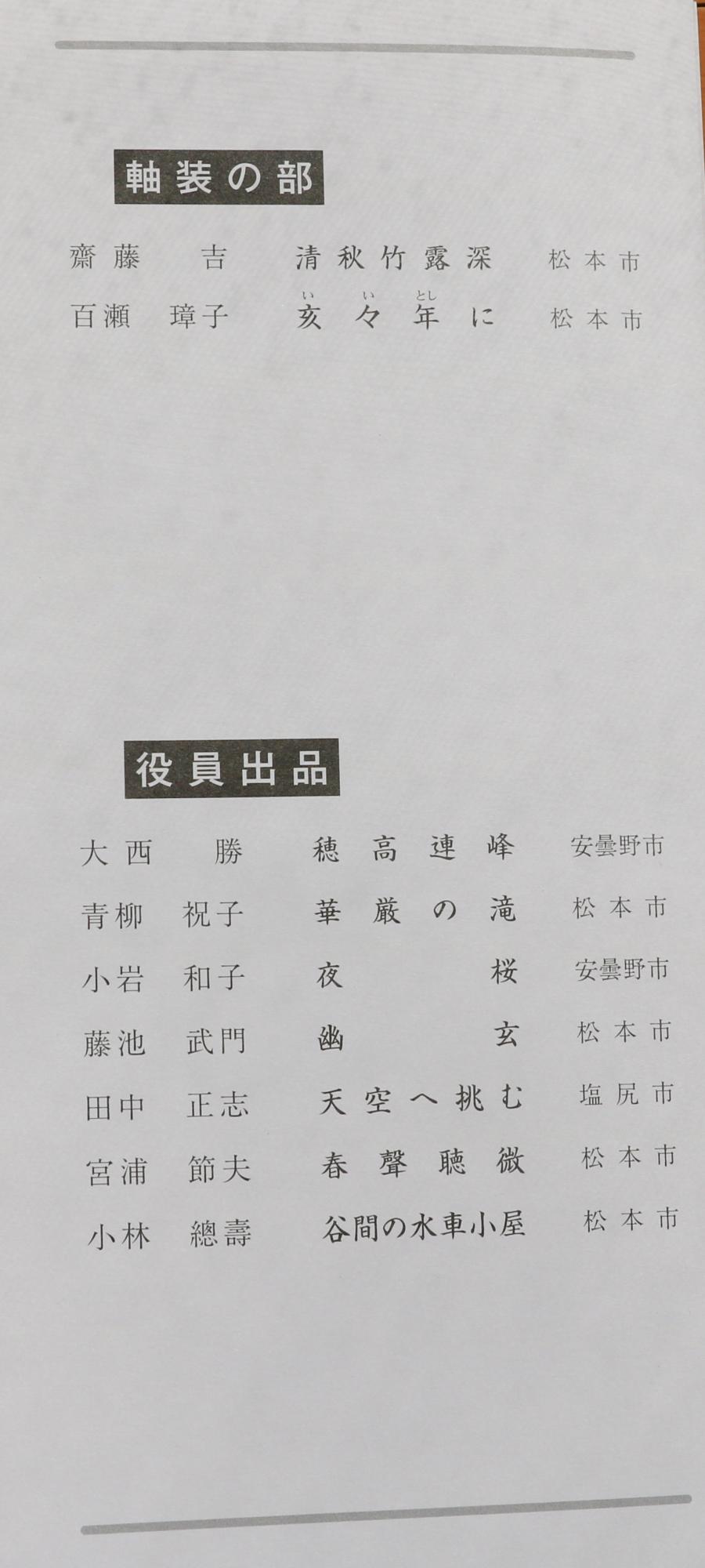 島内の青柳祝子(シニア大学で水墨画教師)さんは、今回は「上高地待春」と「華厳の滝」を描き、特に雪嶺や水の表現に力を入れたと話されていました。又永喜多康三さんや竹倉尚子さんも雪嶺の白さと稜線に力を入れたと話されていました。いずれも大自然に対峙した感動がいきいきと伝わってくる作品でした。