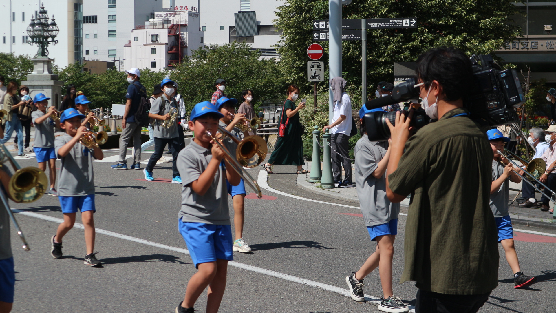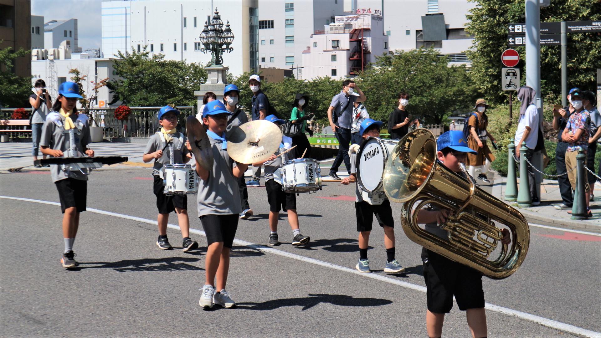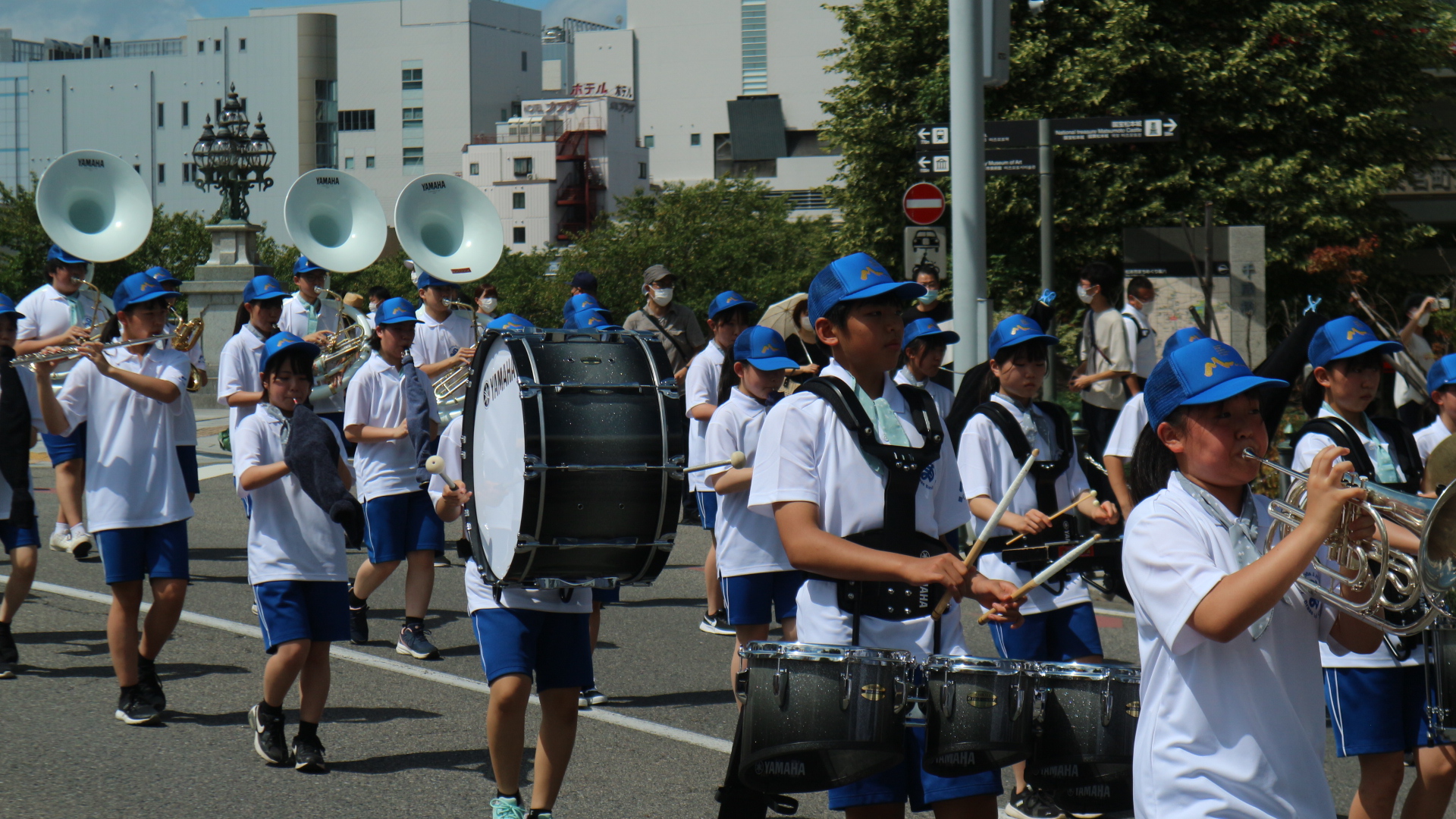 暑い中大きな楽器を歩きながら演奏するのは、小さな体ではとても大変そうでした。ガンバレ!