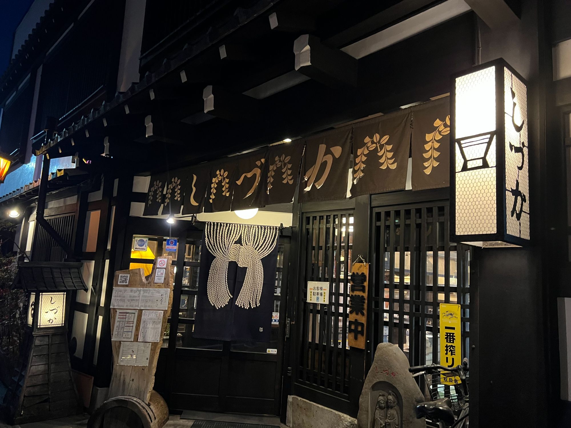 民藝調の看板、暖簾が目を弾きます。街灯や「しづか」の看板は工芸家の飯野歌之助氏の作品かと思います。