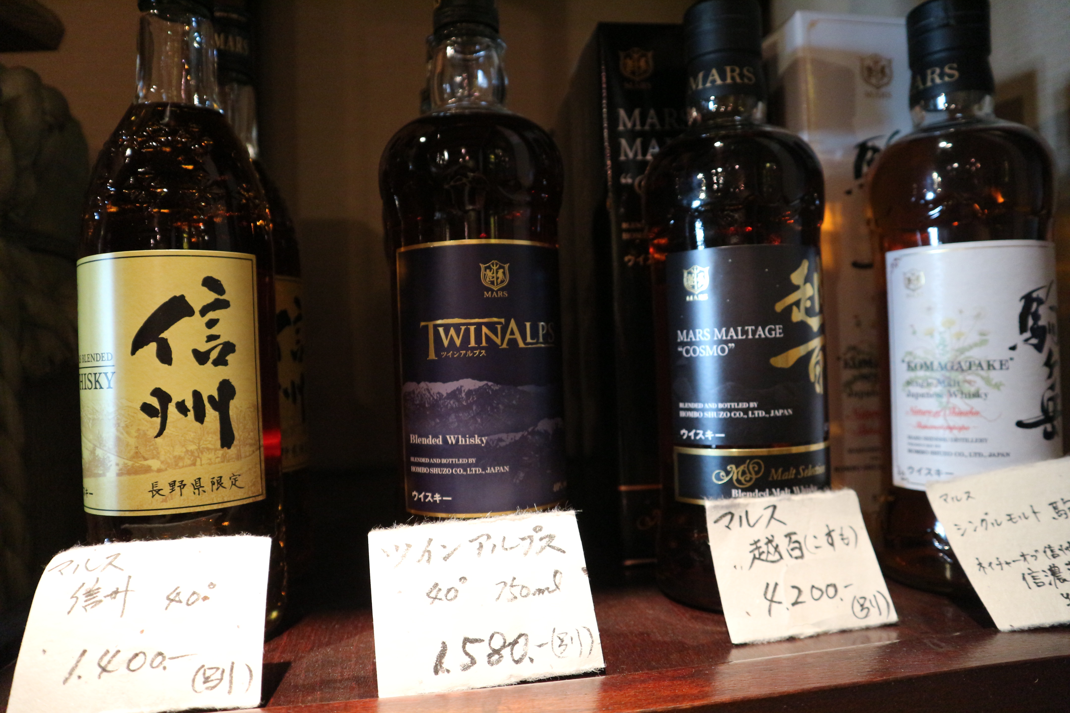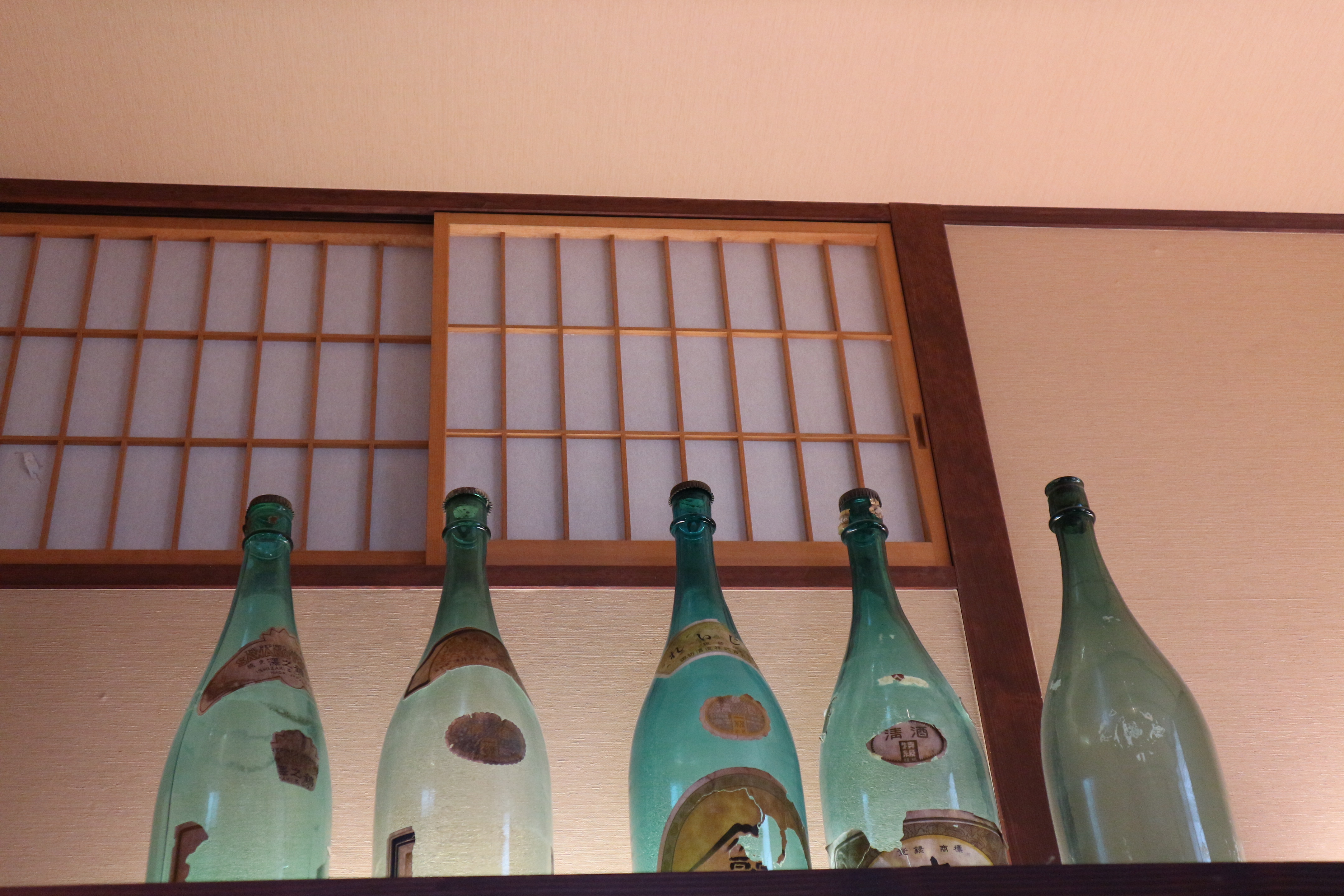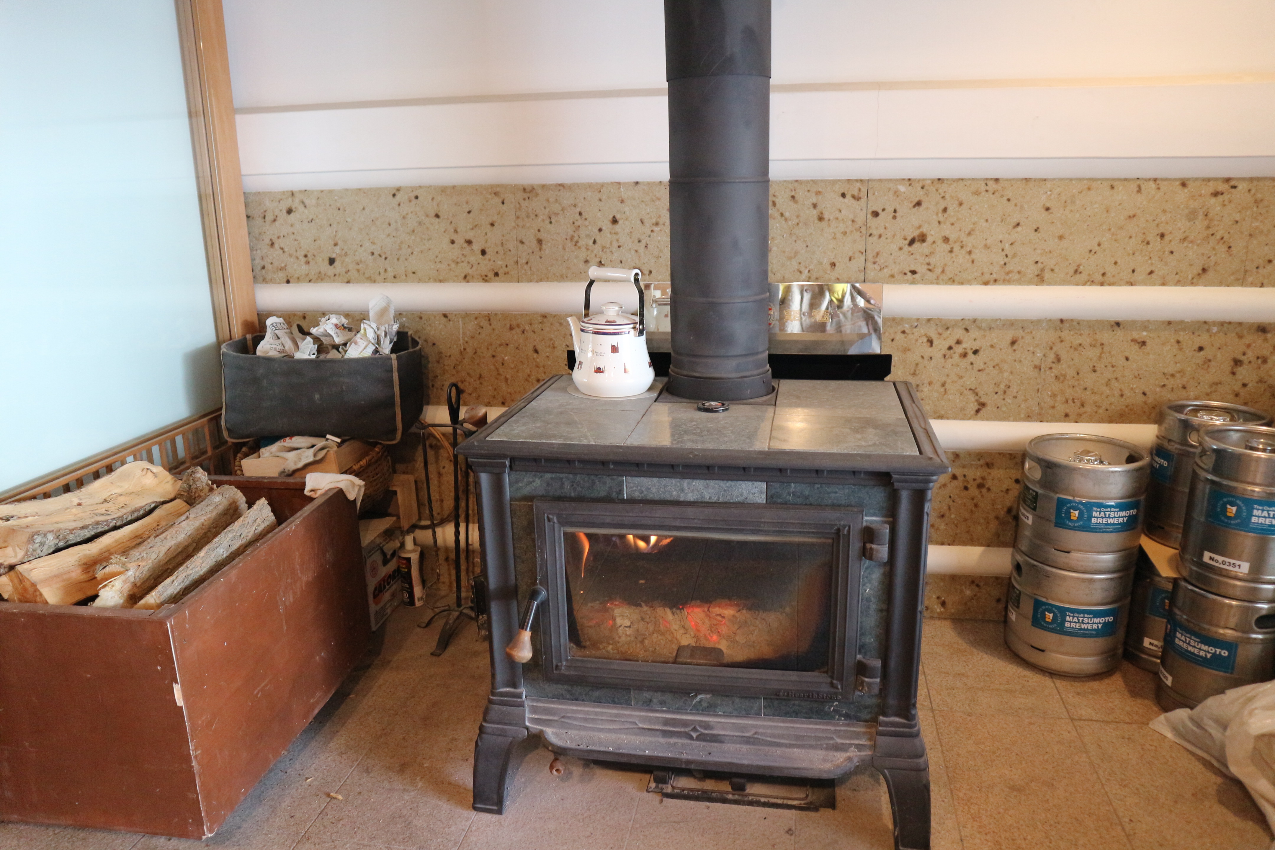 店内に入ると右の薪ストーブが目を惹きます。上を見ると厨子2階の名残のスペースに酒瓶が並んでいます。