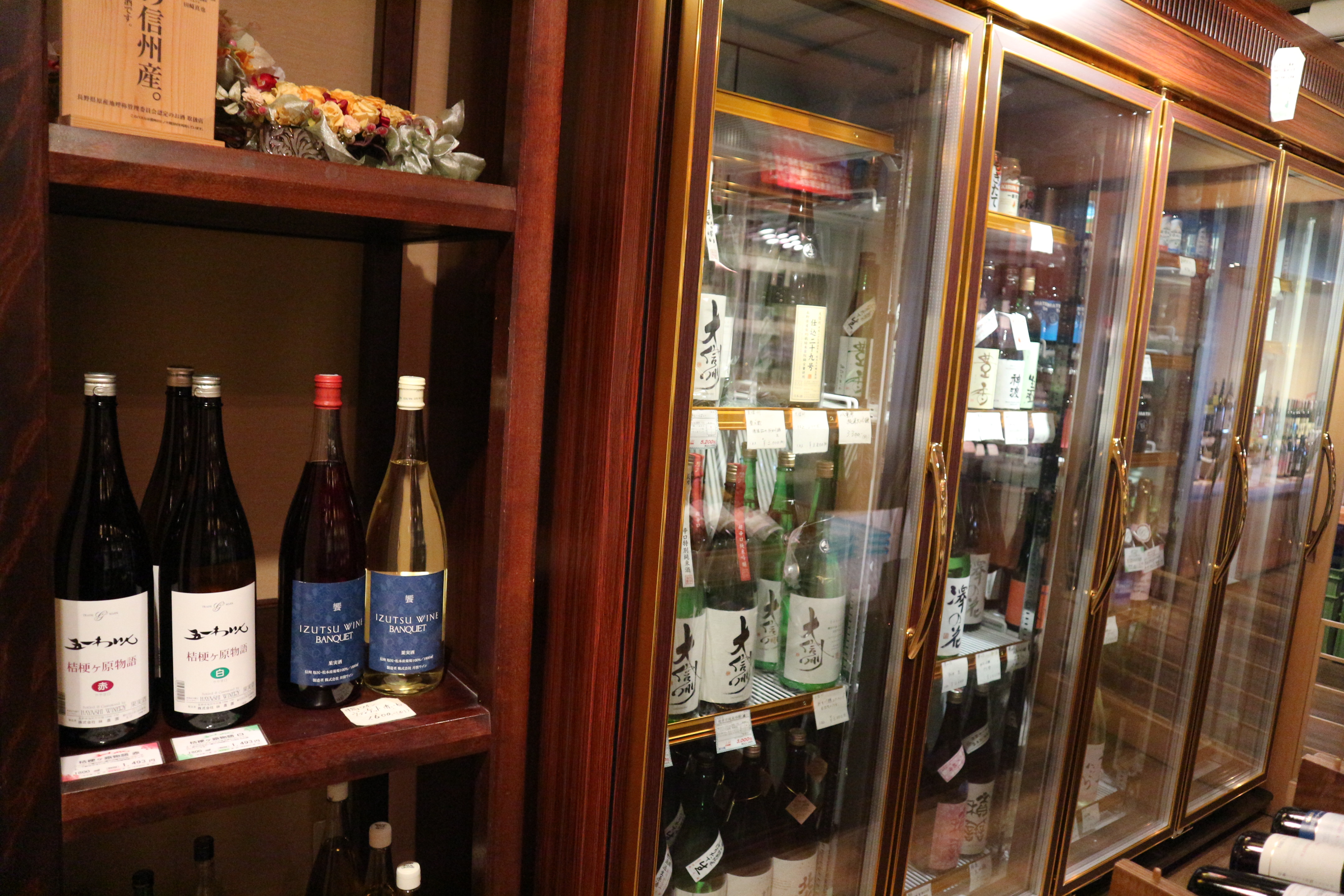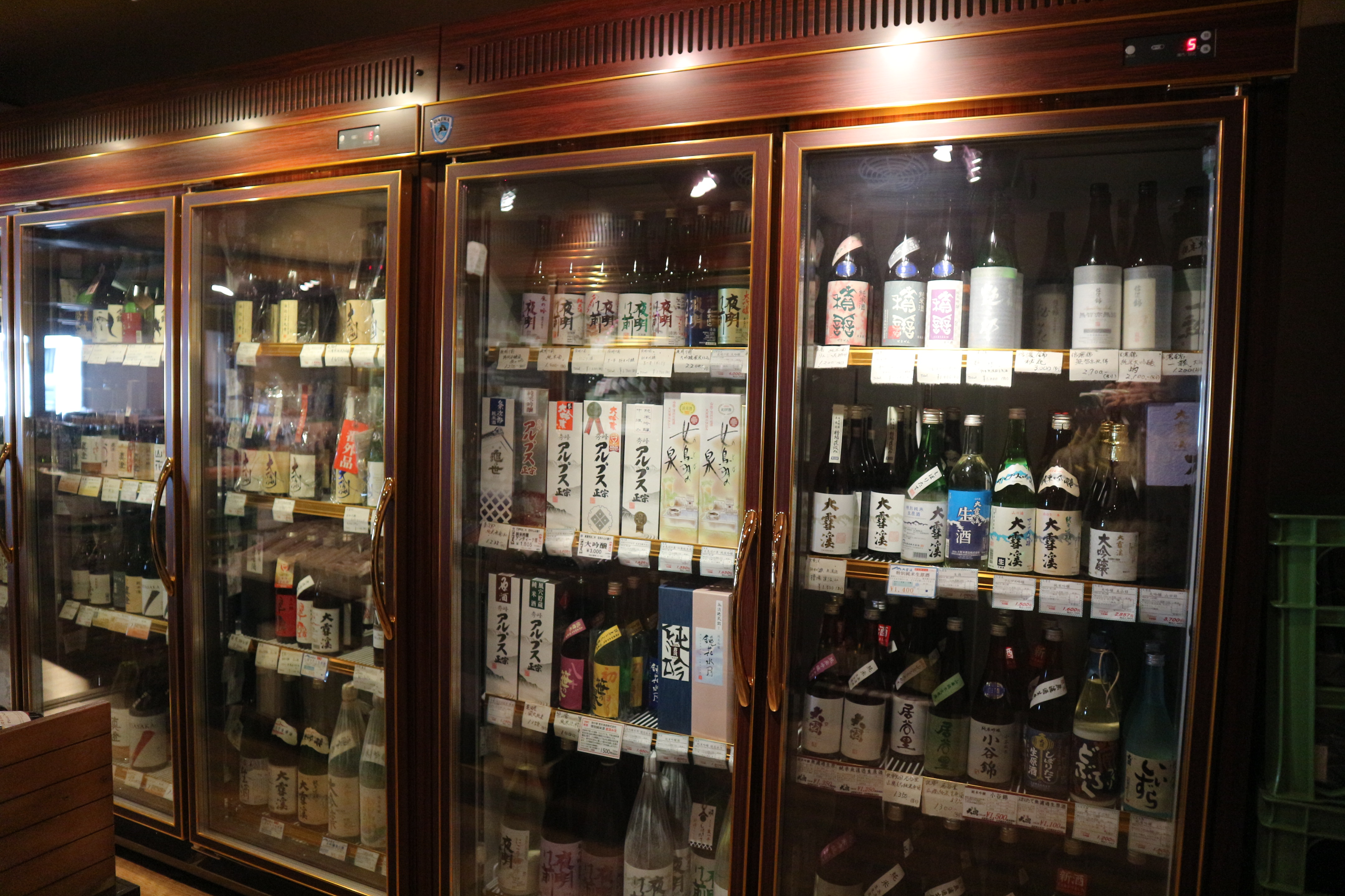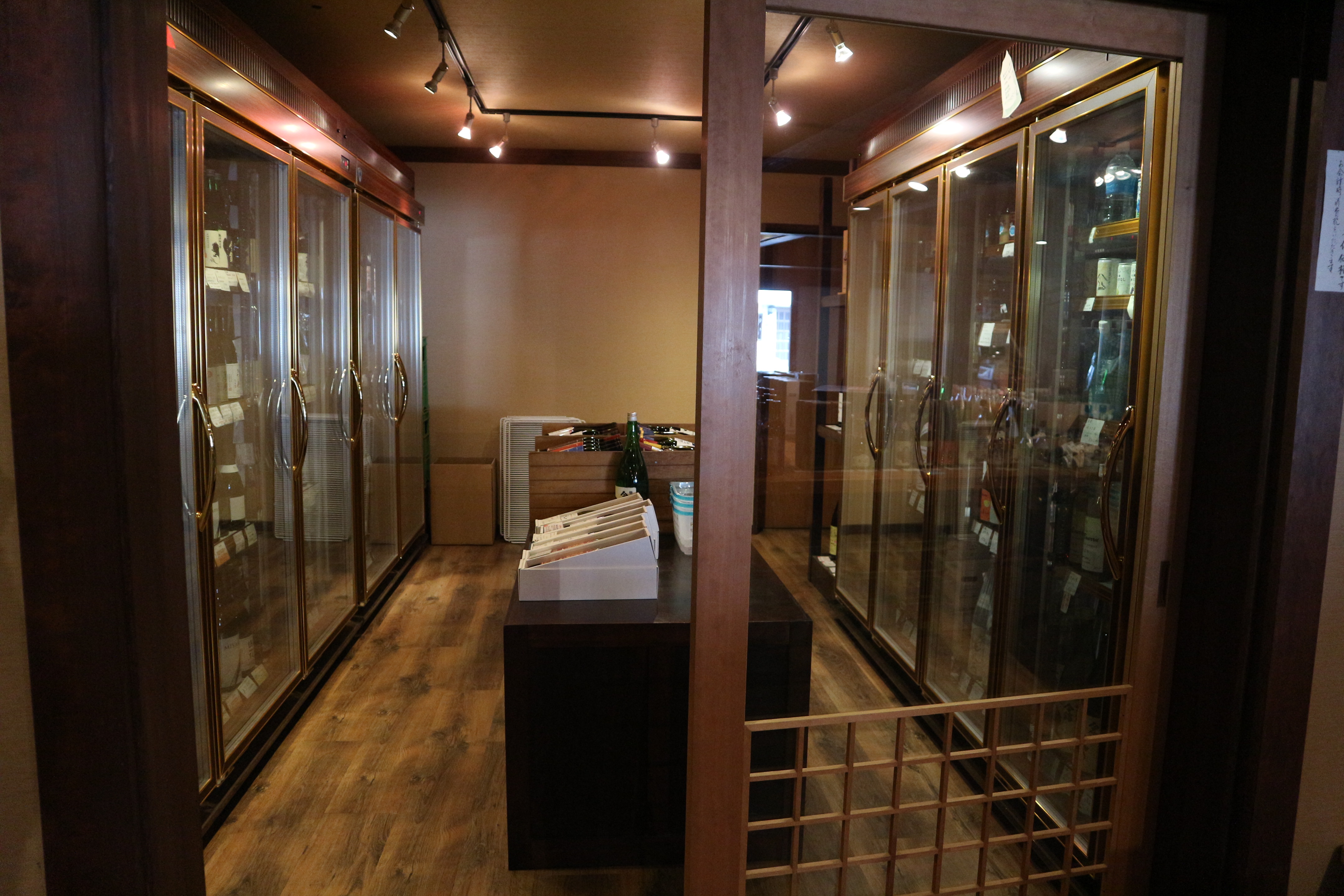 店内奥の扉の向こうには、大きな冷蔵庫があり、吟醸酒やワイン・ジュースなど冷蔵保存庫にも様々なお酒が保管されています。