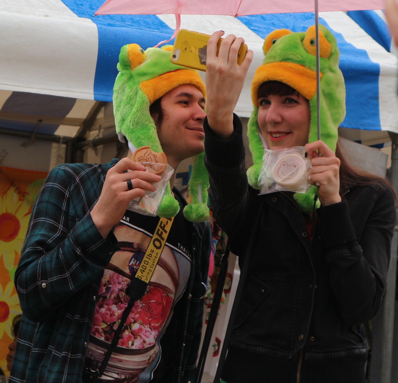 あいにくの雨にもかかわらず大勢のカエル好きな人がナワテ通りに押し寄せていました!
