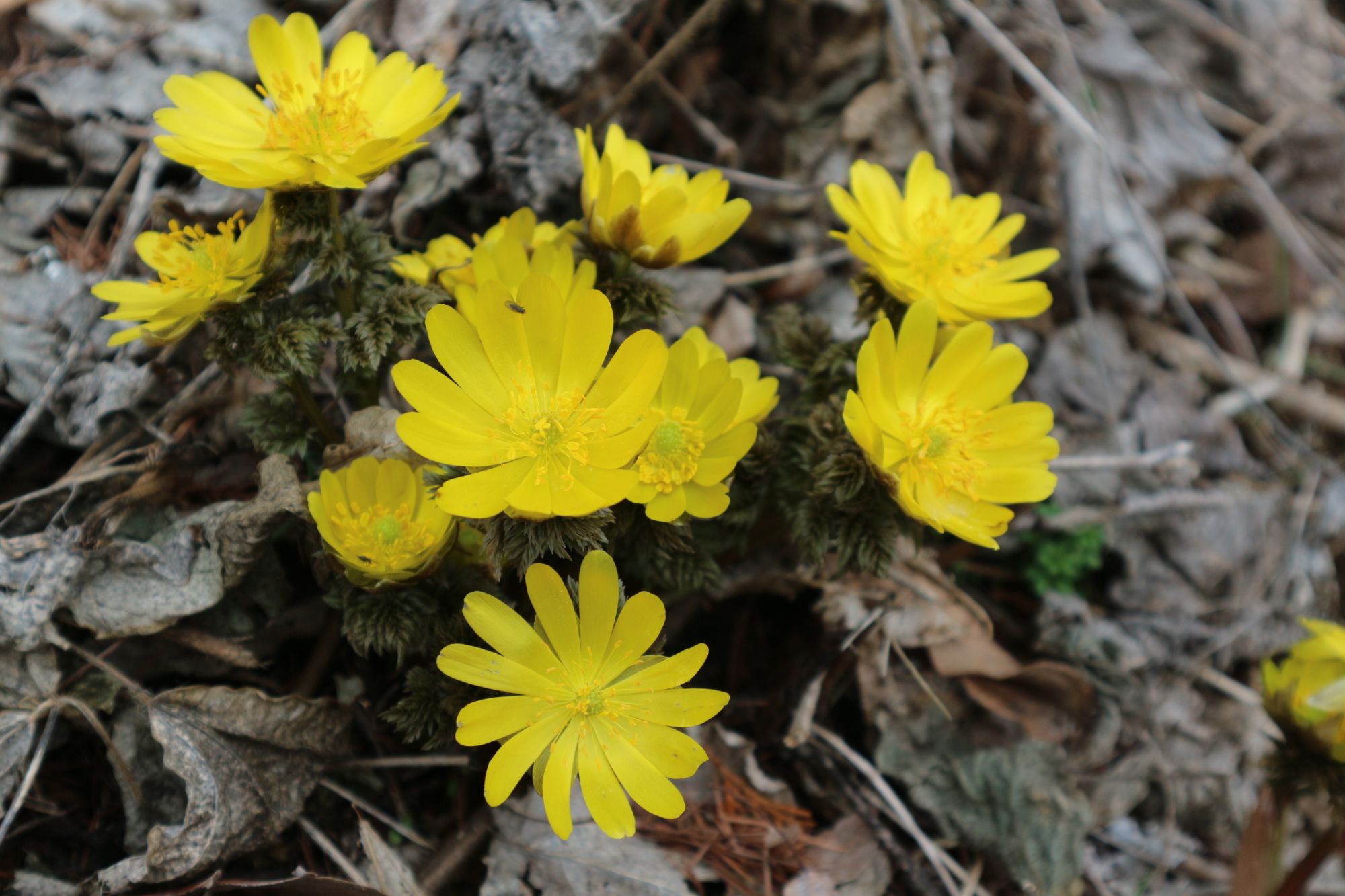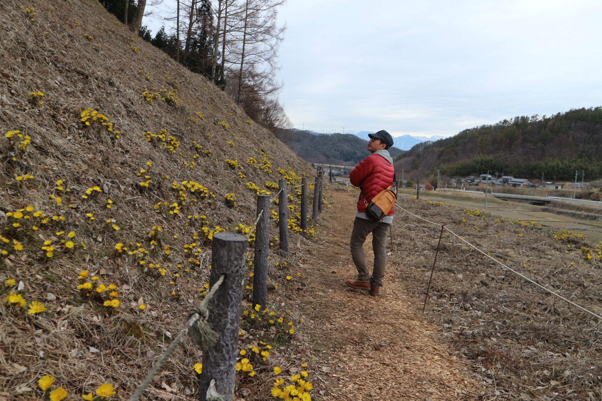 斜面に咲く福寿草を見ながら、散策コースを40分ほどかけて歩きました。